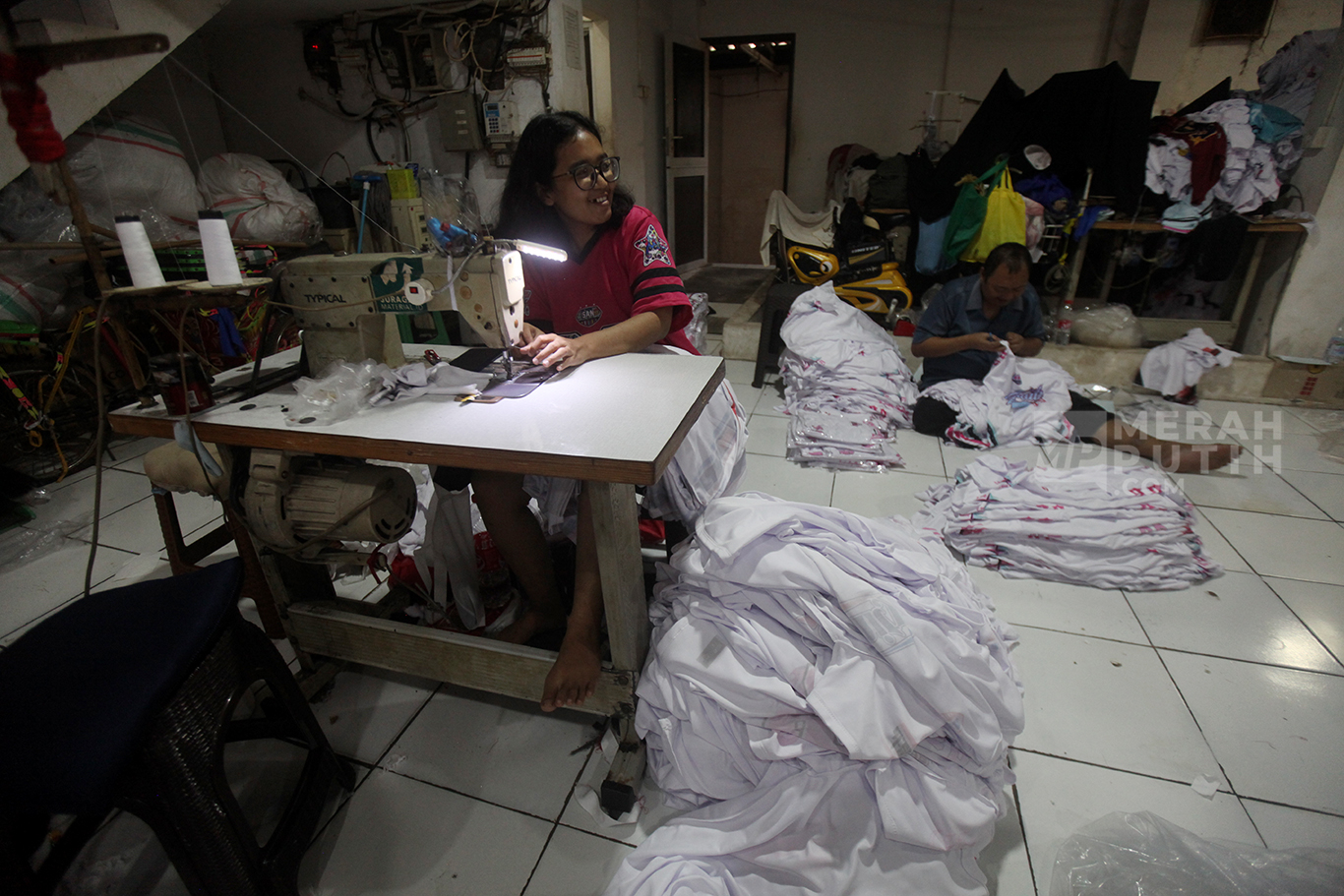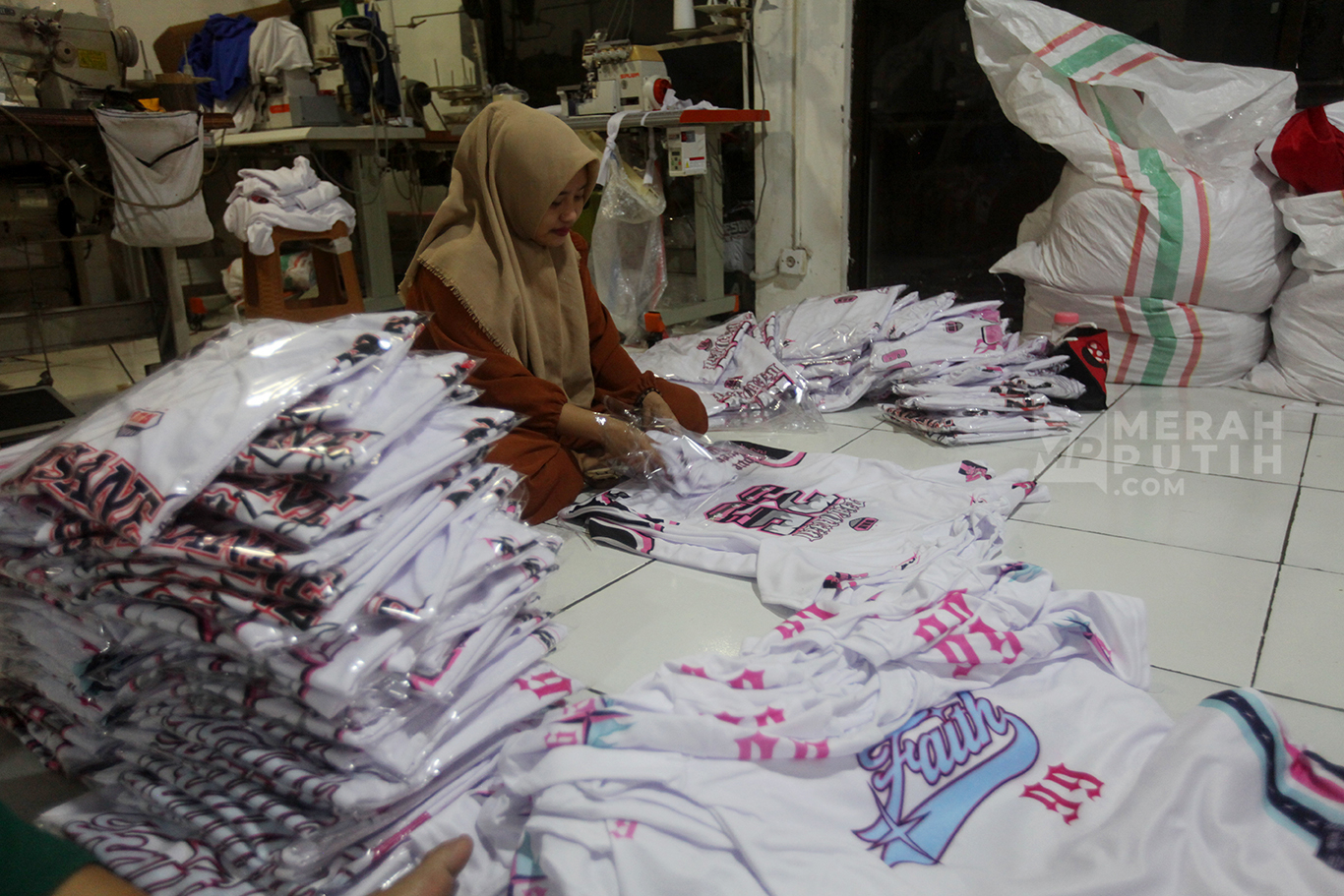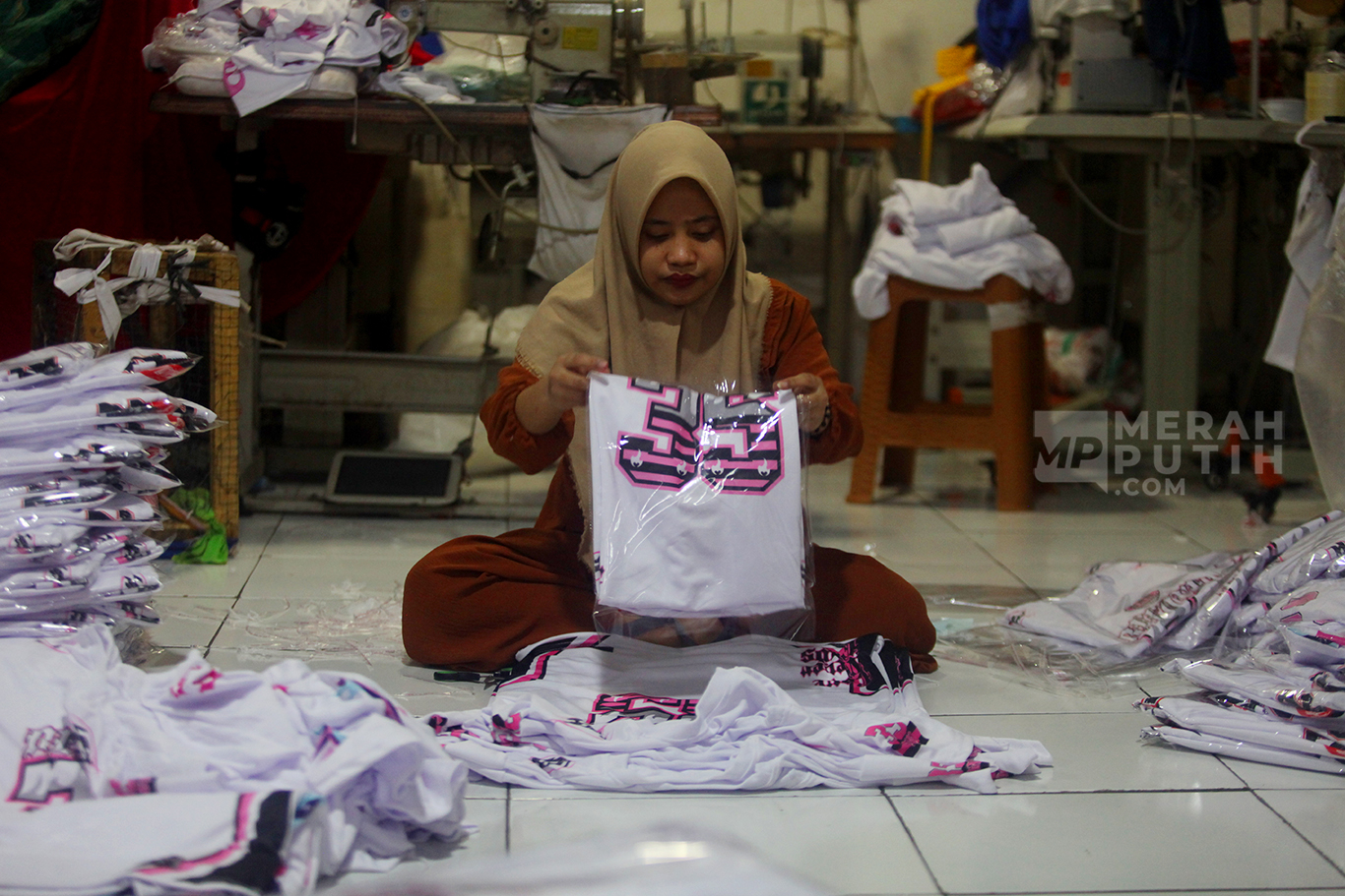 Merahputih.com - Pekerja melipat kaos saat proses produksi UMKM Konveksi Rumahan di Kawasan Jagakarsa, Jakarta Selatan, Selasa (7/10/2025).