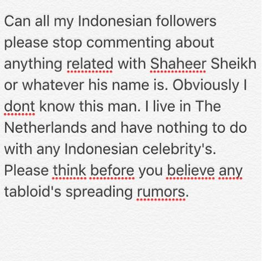 "Bisakah semua followerku yang berasal dari Indonesia berhenti berkomentar tentang apa pun itu yang berkaitan dengan Shaheer Sheikh atau siapa lah namanya itu. Aku benar-benar tak tahu pria ini. Aku tinggal di Belanda dan tak pernah ada hubungan dengan selebriti Indonesia, siapa pun itu. Tolong pikir dulu sebelum kamu percaya rumor apa pun yang beredar di tabloid," tulis Ruba.