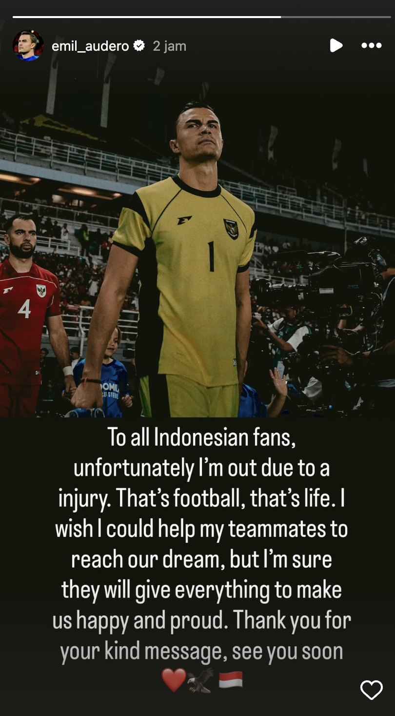 “Kepada seluruh penggemar Indonesia. Sayangnya saya absen karena cedera. Itulah sepak bola, itulah hidup,” tulis Emil Audero dalam unggahan di Instagram, Selasa (7/10).