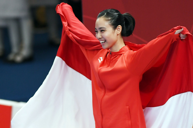 Atlet perempuan berhijab Defia Rosmaniar menyabet medali emas pertama untuk Indonesia dari cabang olahraga taekwondo nomor poomsae (seni kerapian jurus) pada Minggu (19/8).