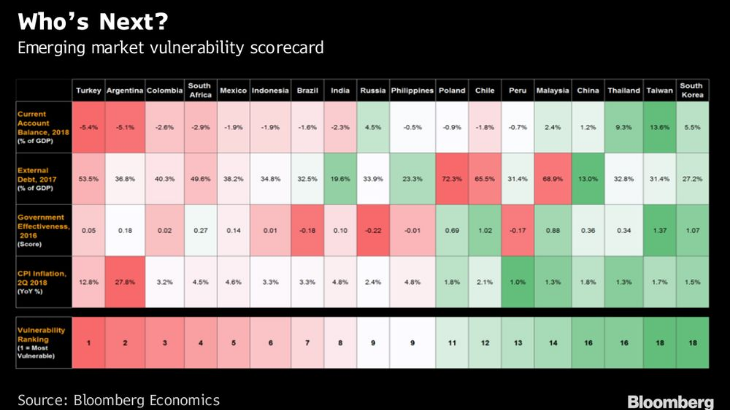 Sebagai informasi, berdasarkan data dari Bloomberg Negara yang menempati No. 1, 2 dan 4 yaitu Turki, Argentina dan Afrika sudah terkena krisis. Sedangkan Indonesia menempati posisi ke 6 sebagai Negara terentan akan krisis dari variabel-variabel ekonomi seperti yang terlihat dari tabel di bawah ini. (*)