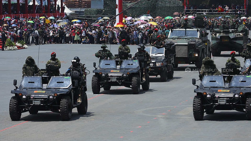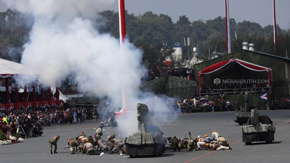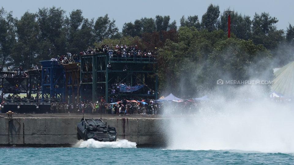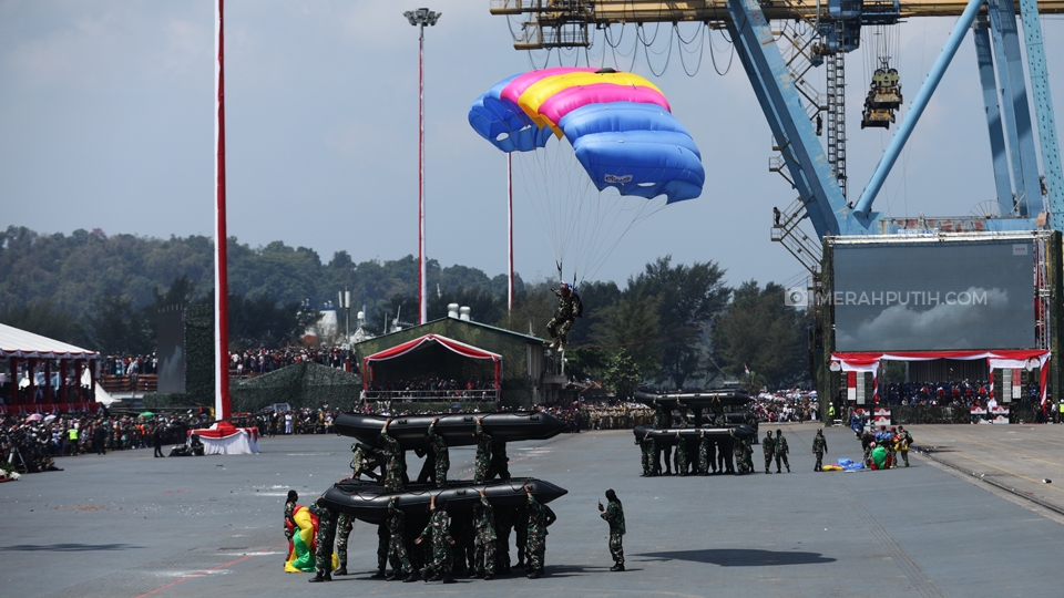 Parade dan defile pasukan serta alutsista milik TNI AD, TNI AU, TNI AL pada perayaan peringatan HUT -Ke-72 TNI di Dermaga PT. Indah Kiat, Cilegon, Banten.