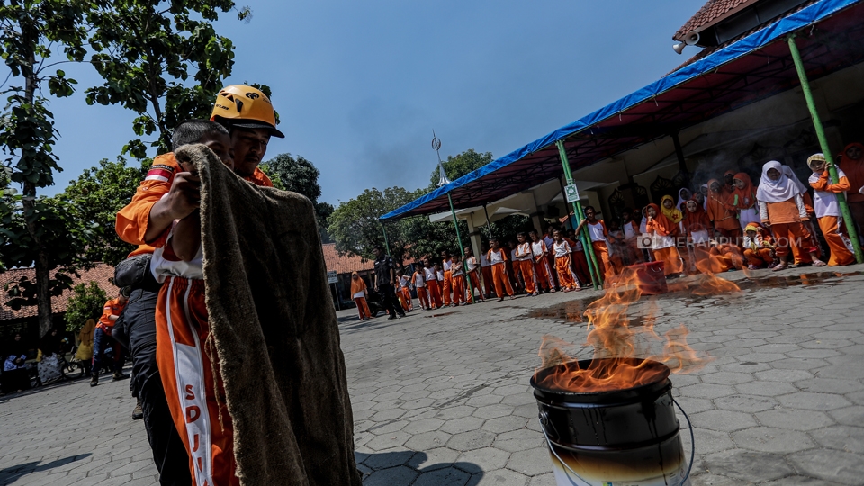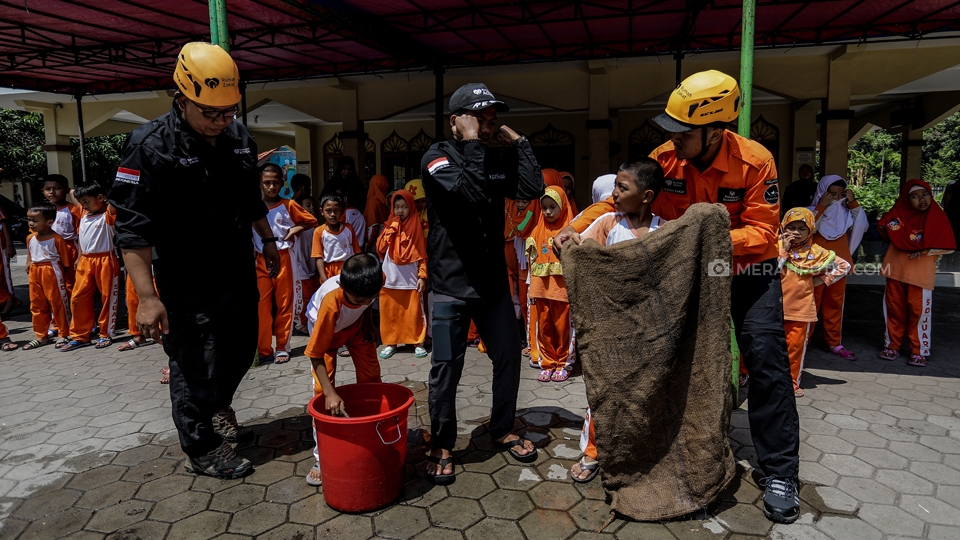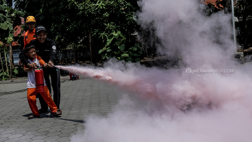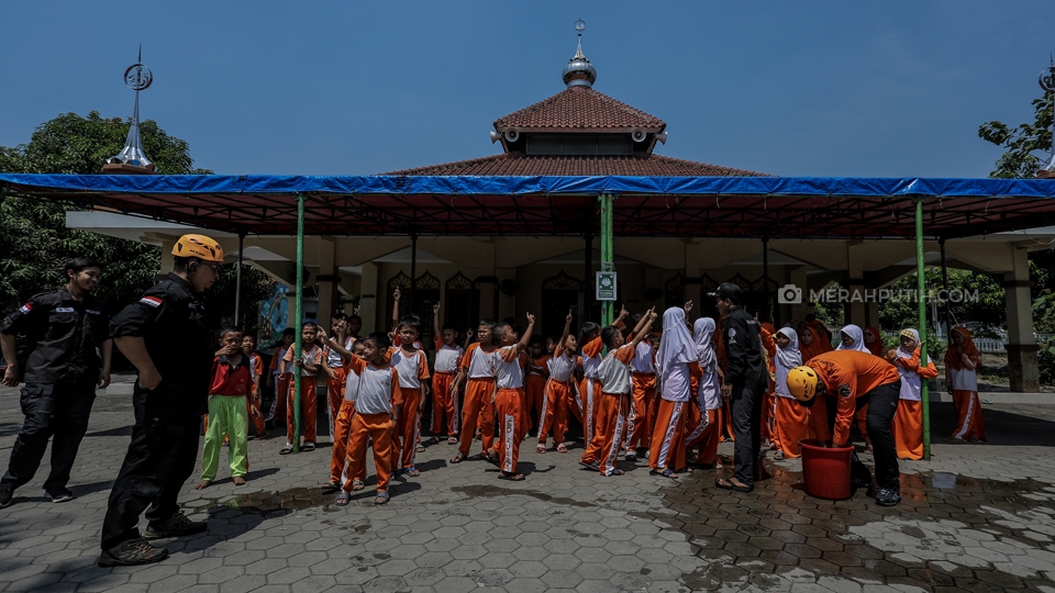 Pelajar Sekolah Dasar (SD) Juara Tangerang berlatih memadamkan api bersama Tim Rescue Rumah Zakat pada peringatan Hari Belajar di Luar Kelas di halaman SD Juara Tangerang, Kota Tangerang, Banten, Kamis, (7/11/2019). Kementerian Pemberdayaan Perempuan dan Perlindungan Anak (Kemen PPPA) melaksanakan kegiatan Outdoor Classroom Day (OCDay) atau Hari Belajar di Luar Kelas yang serentak di seluruh Indonesia. Merahputih.com / Rizki Fitrianto