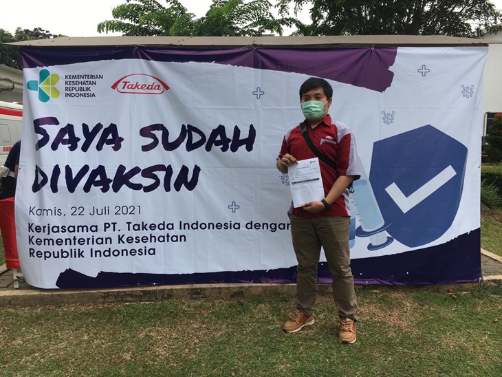 Vaksin dilaksanakan di pabrik PT. Takeda Indonesia, Bekasi, Jawa Barat, pada Kamis, 22 Juli 2021. Presiden Direktur PT Takeda Indonesia, M. Idham Hamzah mengatakan vaksinasi gratis diberikan kepada para karyawan perusahaan guna melindungi mereka dari bahaya penularan COVID-19.