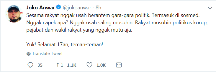 "Rakyat musuhin politikus korup, pejabat dan wakil rakyat yang enggak mutu aja, yuk! Selamat 17-an, teman-teman!" tambah Joko Anwar.