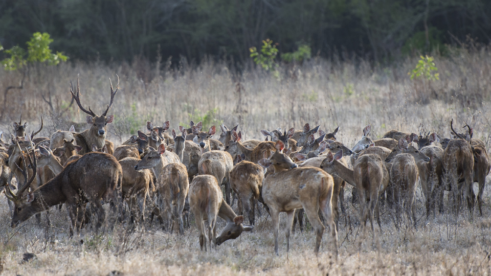 Ratusan rusa berjemur di padang sabana Bekol di Taman Nasional Baluran, Situbondo, Jawa Timur. Kawasan yang memiliki luas 25 ribu hektar tersebut memiliki sekitar 444 jenis tumbuhan, 26 jenis mamalia, 155 jenis burung dan terdapat lokasi wisata bahari serta lokasi pengamatan burung migran. ANTARA FOTO/M Agung Rajasa
