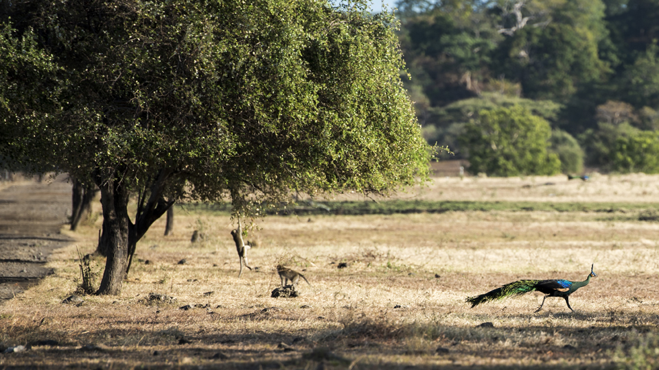 Burung merak melintas di padang sabana Bekol di Taman Nasional Baluran, Situbondo, Jawa Timur. Kawasan yang memiliki luas 25 ribu hektar tersebut memiliki sekitar 444 jenis tumbuhan, 26 jenis mamalia, 155 jenis burung dan terdapat lokasi wisata bahari serta lokasi pengamatan burung migran. ANTARA FOTO/M Agung Rajasa