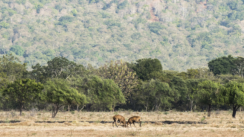 Dua rusa beradu kepala di padang sabana Bekol di Taman Nasional Baluran, Situbondo, Jawa Timur. Kawasan yang memiliki luas 25 ribu hektar tersebut memiliki sekitar 444 jenis tumbuhan, 26 jenis mamalia, 155 jenis burung dan terdapat lokasi wisata bahari serta lokasi pengamatan burung migran. ANTARA FOTO/M Agung Rajasa
