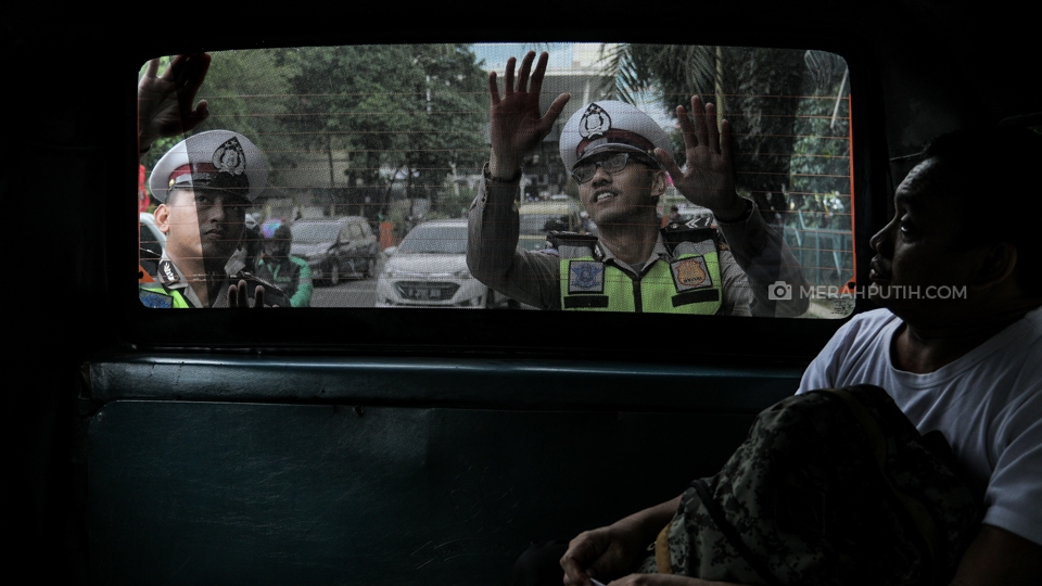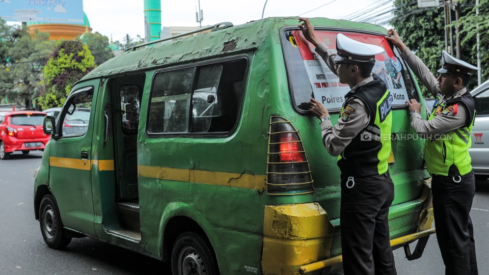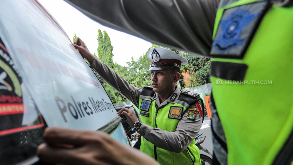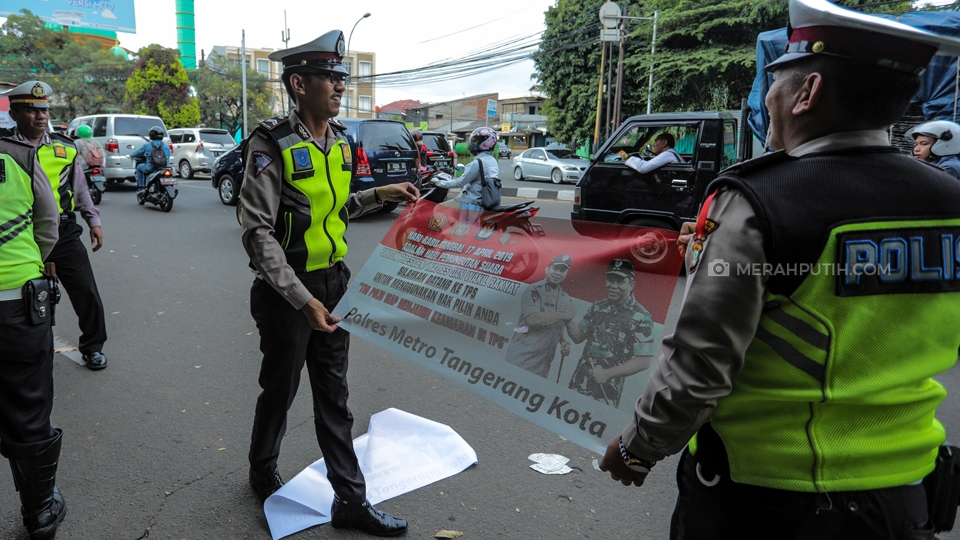 Petugas Kepolisian Satuan Lalu Lintas Polres Metro Tangerang Kota tengah memasang sticker himbauan keamanan TNI-POLRI saat pemilu 2019 nanti di Cikokol, Kota Tangerang, Banten, Kamis, (11/4/2019). Kapolri Jenderal Polisi Tito Karnavian dan Panglima TNI Marsekal Hadi Tjahjanto menjamin kemanan masyarakat saat pelaksanaan pemilu 2019 nanti. Merahputih.com / Rizki Fitrianto