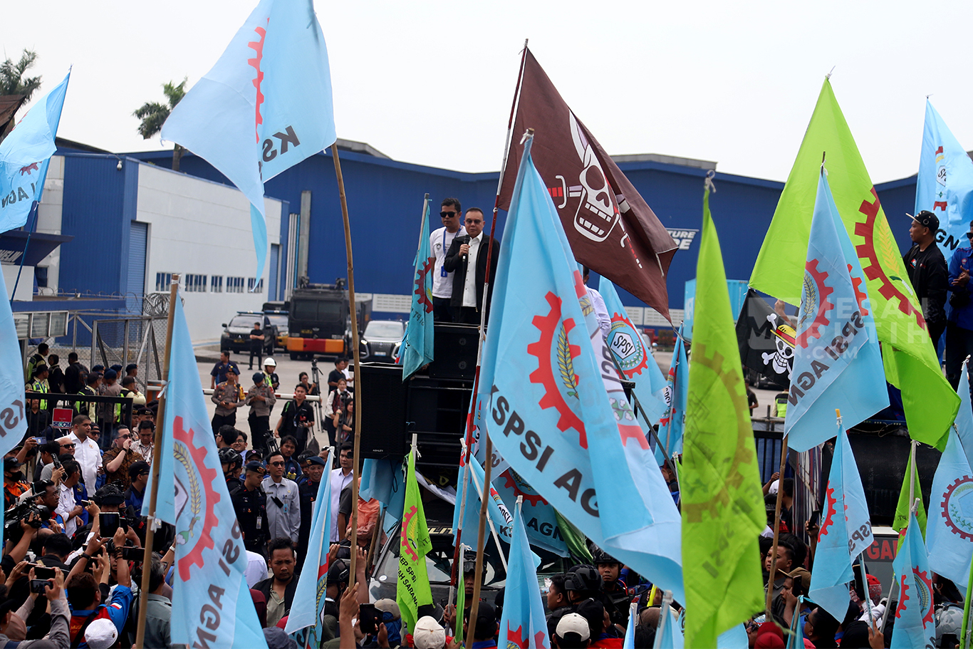 Merahputih.com - Wakil Ketua DPR Sufmi Dasco Ahmad, menemui massa buruh yang berunjukrasa di depan gerbang, usai bertemu Pihak Majemen Pabrik Ban Michelin, saat melakukan Inspeksi Mendadak (Sidak) ke Kawasan Cikarang, Jawa Barat, Senin (3/11/2025).