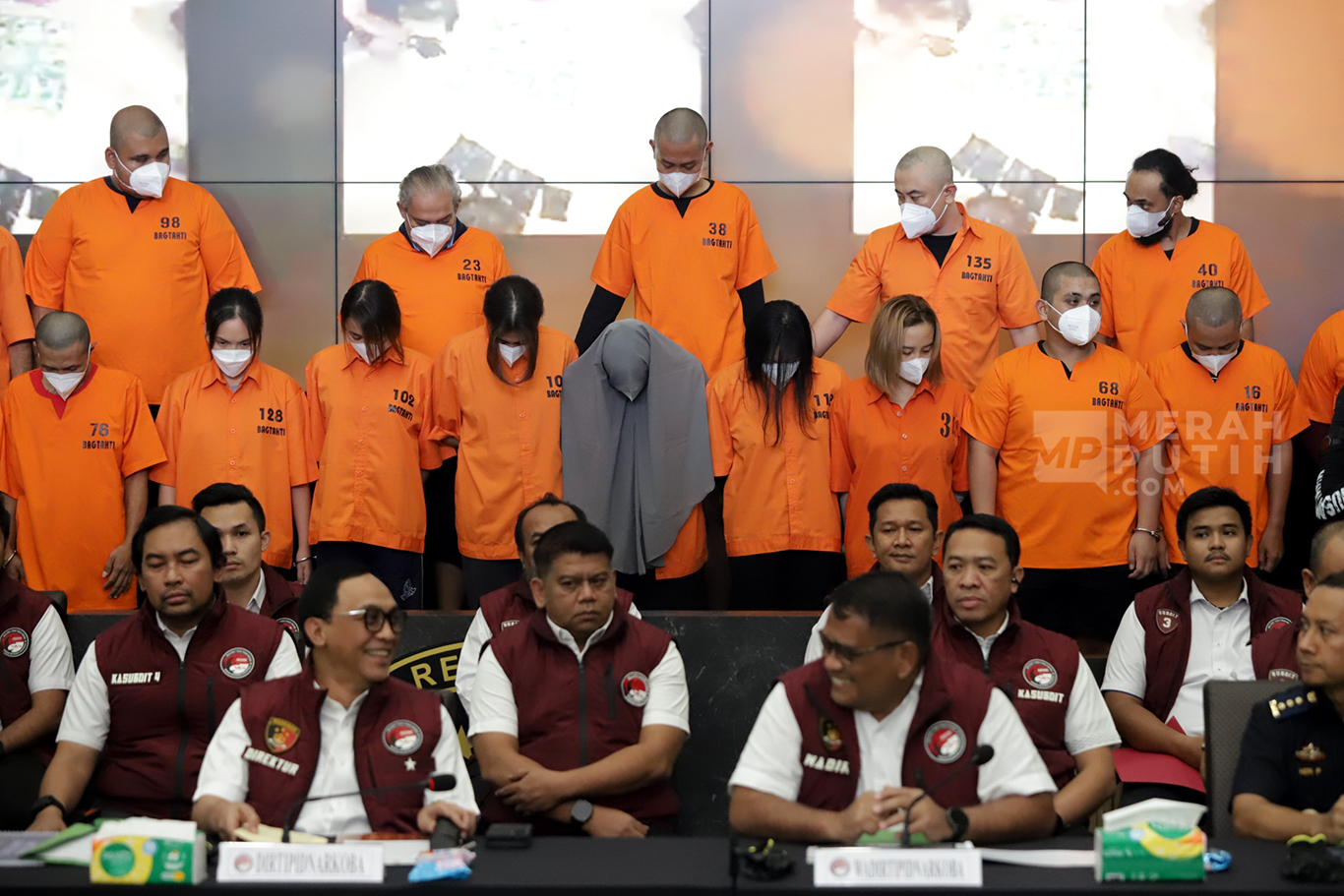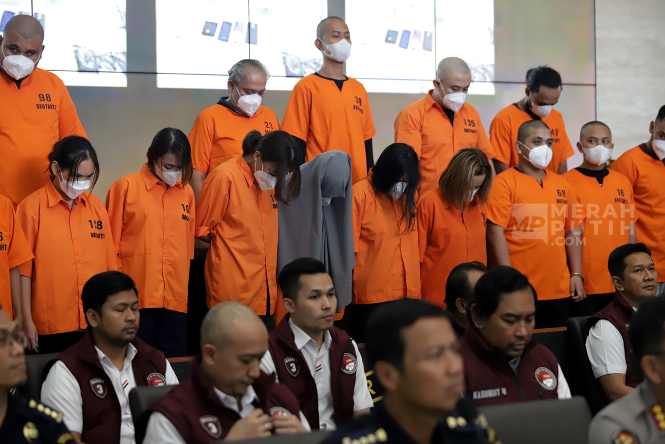 Merahputih.com - Tujuh belas tersangka anggota jaringan pengedar narkoba yang akan mengedarkan narkoba pada konser Djakarta Warehouse Project (DWP) di Bali digelandang saat konpers di Bareskrim Mabebes Polri, Jakarta, Senin (22/12/2025). Mereka ditangkap dalam operasi di beberapa lokasi berbeda di kawasan Bali, pada kurun 9-11 Desember 2025 sebelum event Djakarta Warehouse Project (DWP) dimulai.