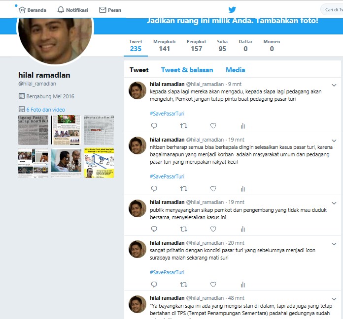 “Sampai sekarang pedagang belum mendapatkan sertifikat. Izin operasional dari Pemkot Surabaya belum keluar,” kicau Hilal melalui akun Twitter pribadinya, @hilal_ramadlan