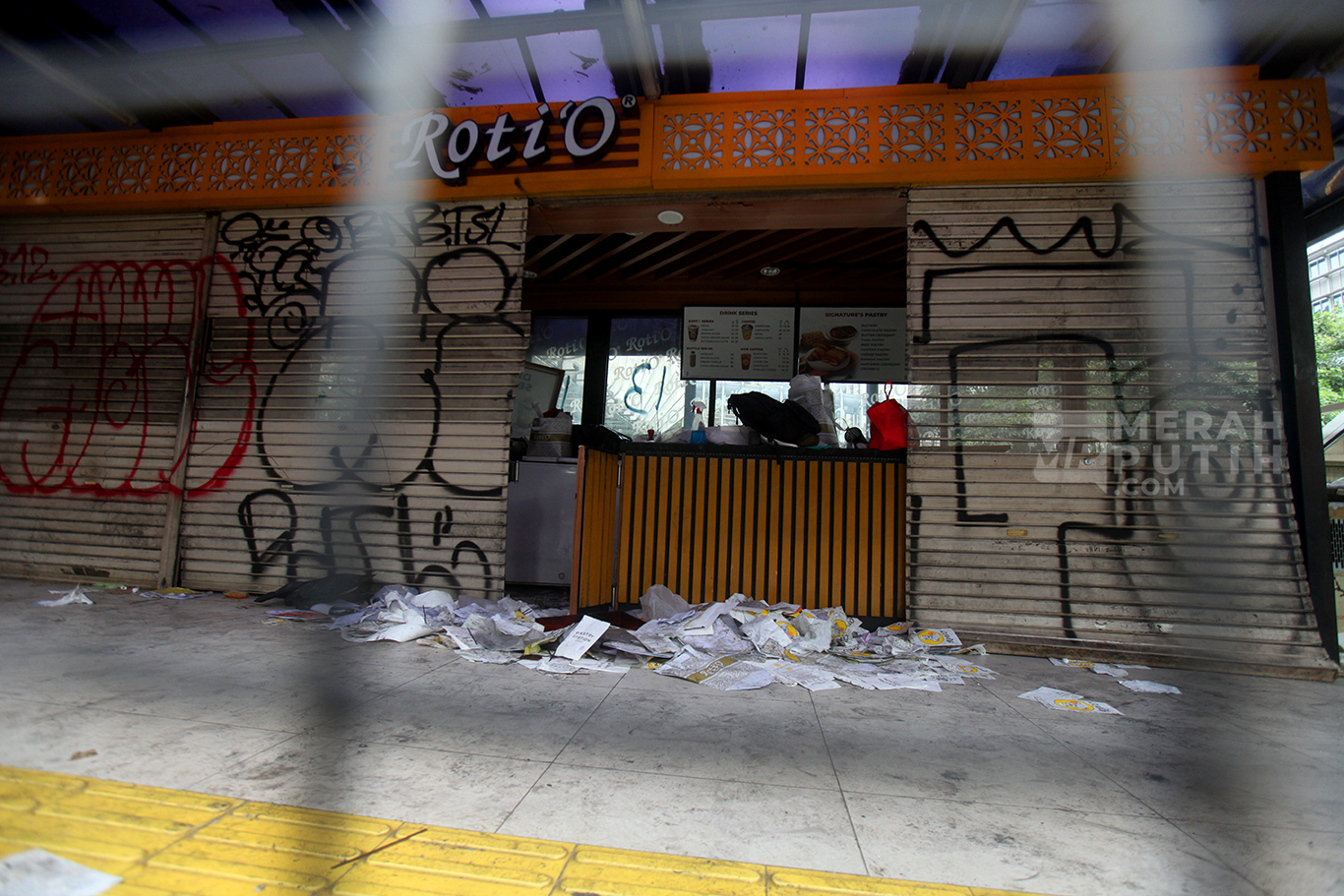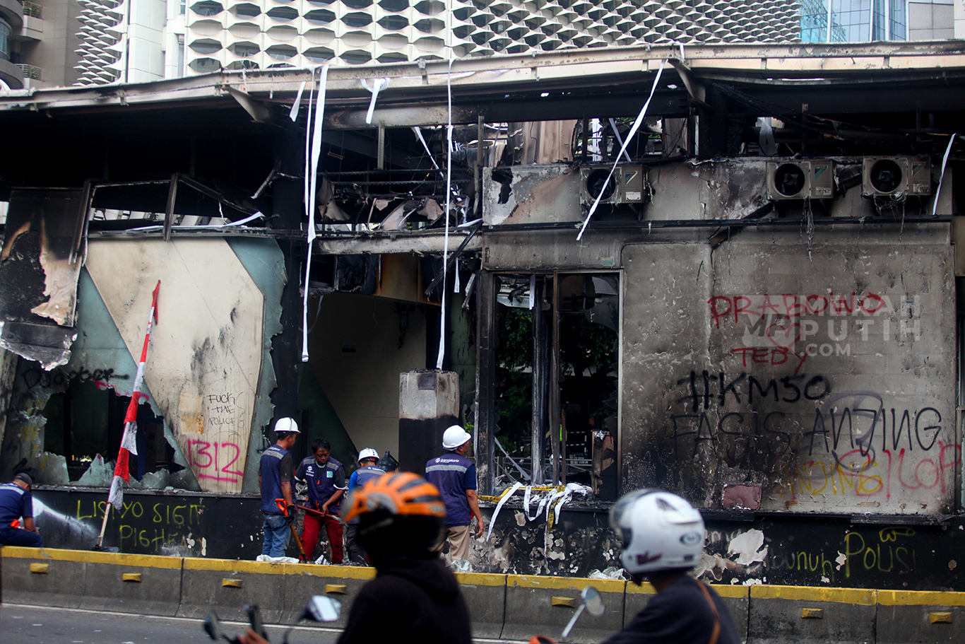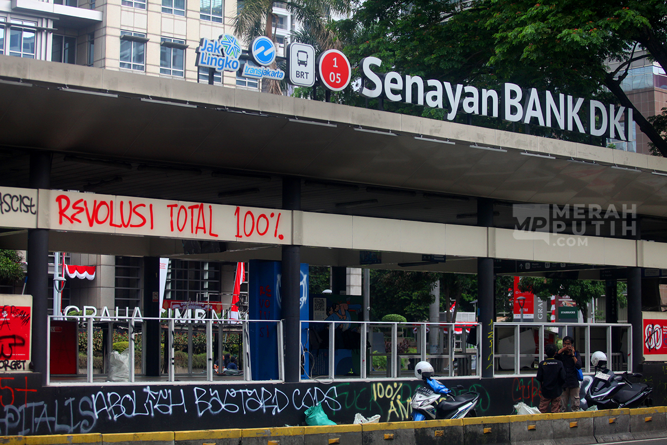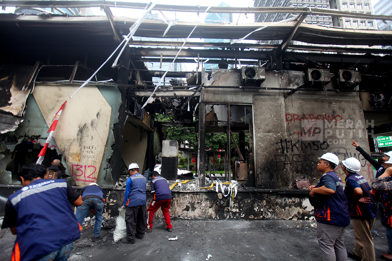 Sedikitnya lima halte Transjakarta yaitu Halte Senayan, GBK, Polda Metro, Halte Toyota Rangga dan Halte Sentral Senen serta empat pintu masuk Stasiun MRT Senayan Bank DKI, sejumlah halte Trotoar dan fasiltas umum rusak akibat kemarahan massa. (MP/Didik Setiawan).