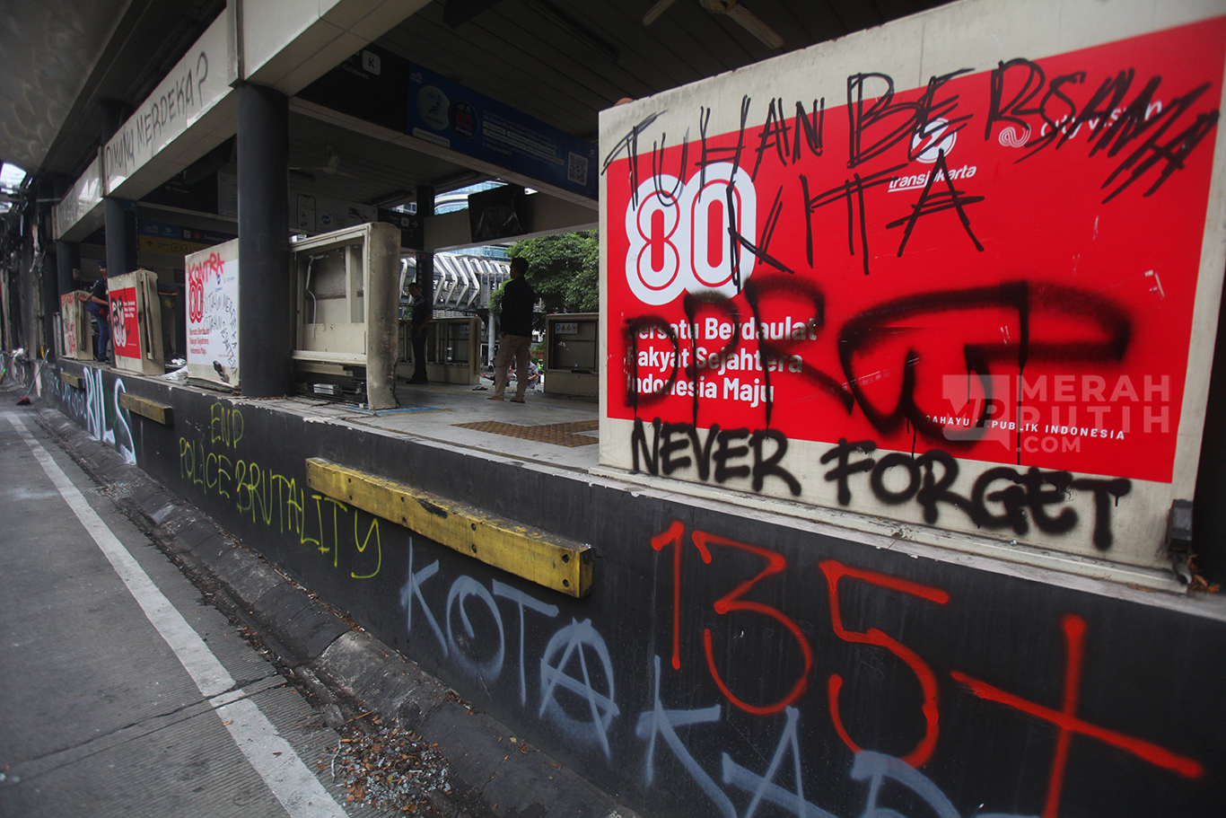 Merahputih.com - Kondisi kerusakan Halte Bus Transjakarta Senayan Bank DKI rusak parah pasca demo di Kawasan Senayan, Jakarta, Sabtu (30/8/2025).