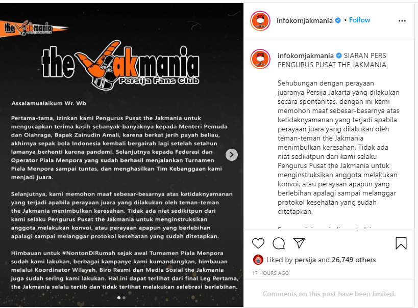"Hal ini menggambarkan bahwa the Jakmania masih menahan diri, masih mematuhi protokol dan komitmen bersama yang telah ditetapkan untuk tetap berada di rumah," tulisnya.