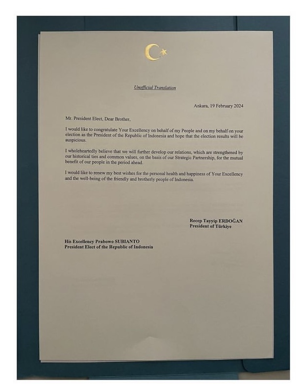 Prabowo telah mengunggah surat ucapan Erdogan itu dalam akun Instagram @prabowo. Dalam suratnya, Erdogan berdoa agar masyarakat Indonesia dapat hidup sejahtera dan tetap bersaudara di bawah kepemimpinan Prabowo nantinya setelah dilantik.
