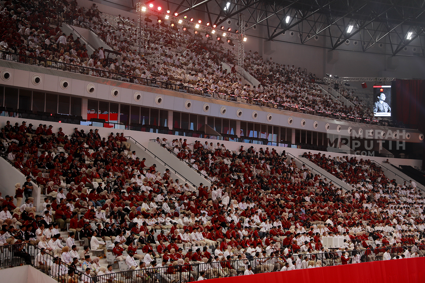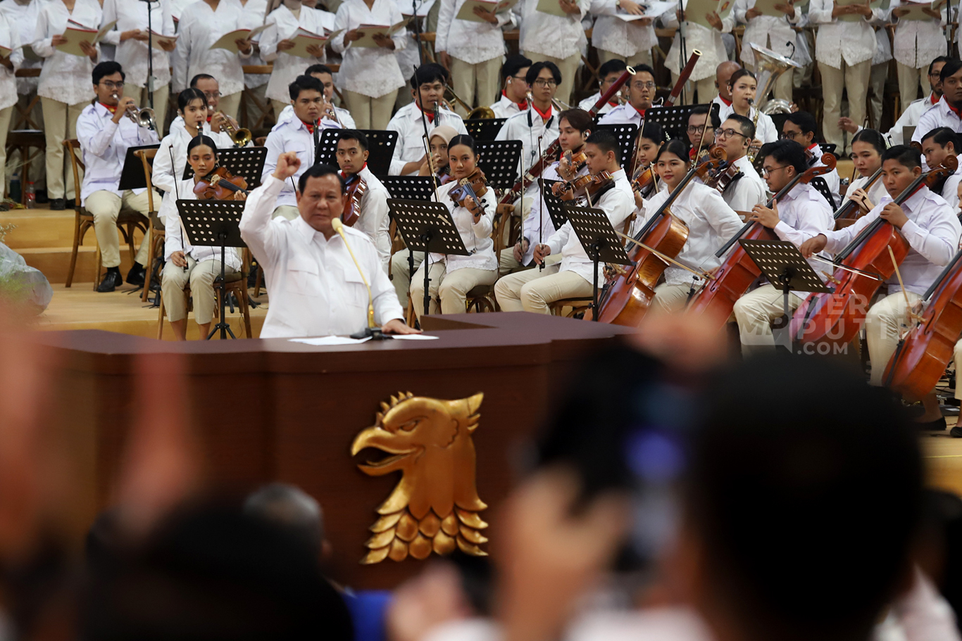 MerahPutih.com - Ketua Umum Partai Gerindra sekaligus presiden terpilih Prabowo Subianto menyampikan sambutan saat acara Penutupan Rapat Pimpinan Nasional (Rapimnas) Partai Gerindra di Indonesia Arena, GBK, Senayan, Jakarta, Sabtu (31/8/2024).