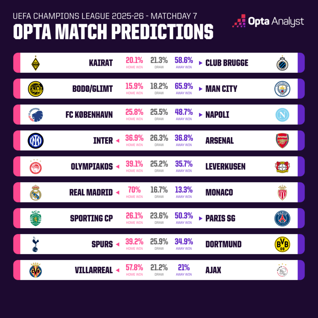 Berikut merupakan prediksi lengkap Matchday 7 Liga Champions Eropa versi Superkomputer Opta: