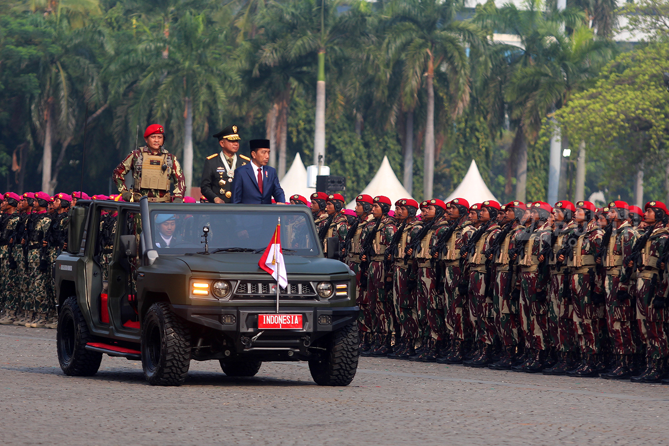 Dalam sambutannya, Presiden Jokowi mengapresiasi kinerja TNI dari tiga matra yaitu darat, laut, dan udara. Dalam sambutannya Presiden Joko Widodo juga berpesan kepada seluruh prajurit TNI untuk menjaga stabilitas nasional jelang Pelantikan Presiden dan Pilkada Serentak tahun 2024. (MP/DIdik Setiawan).