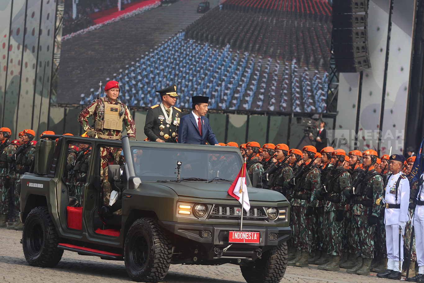 Merahputih.com - Presiden Joko Widodo didampingi Panglima TNI Jenderal Agus Subiyanto melaksanakan inspeksi pasukan saat Upacara Peringatan HUT ke-79 TNI di Lapangan Monumen Nasional (Monas), Jakarta, Sabtu (5/10/2024).
