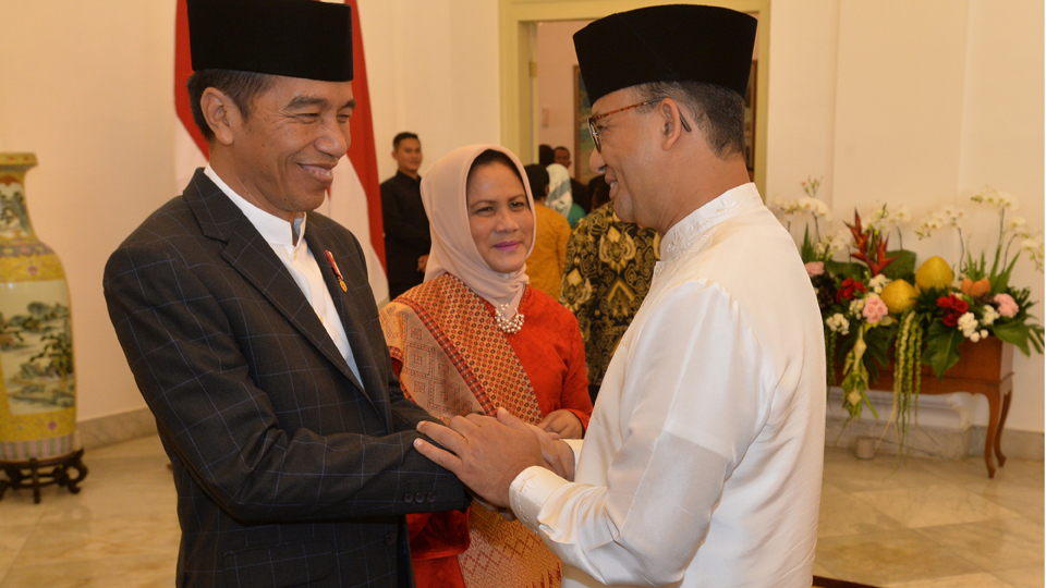 Presiden Joko Widodo (kiri) dan Ibu Negara Iriana Joko Widodo (tengah) berjabat tangan dengan Gubernur DKI Jakarta Anies Baswedan (kanan) di acara Silahturahmi Idul Fitri 1 Syawal 1439 H di Istana Kepresidenan Bogor, Jawa Barat. Presiden Joko Widodo dan Ibu Negara Iriana Jokowi melakukan silahturahmi lebaran dengan berbagai kalangan masyarakat mulai pejabat negara, menteri Kabinet Kerja dan masyarakat umum yang tinggal di sekitar Kota Bogor, Jawa Barat. ANTARA FOTO/Widodo S Jusuf