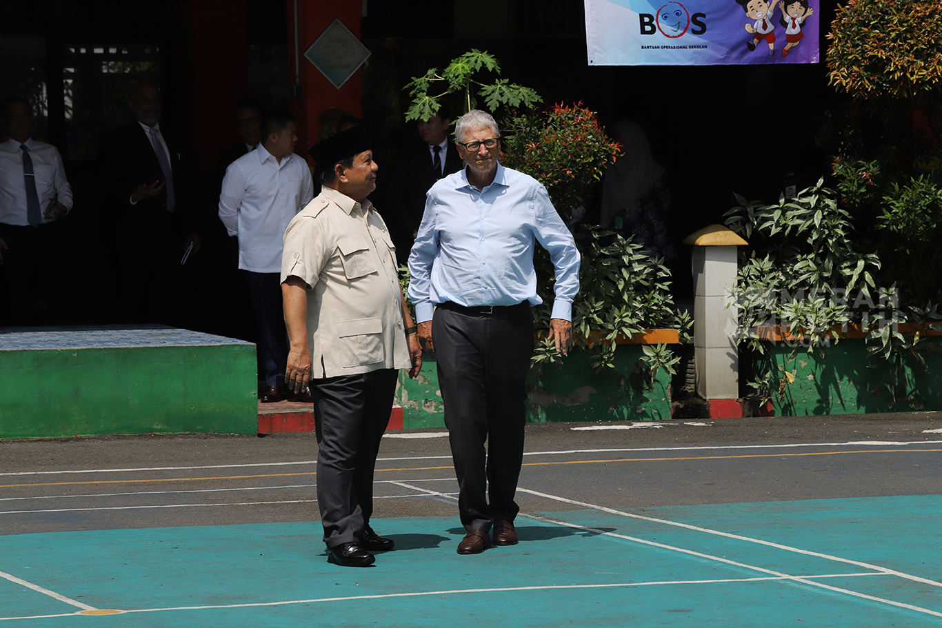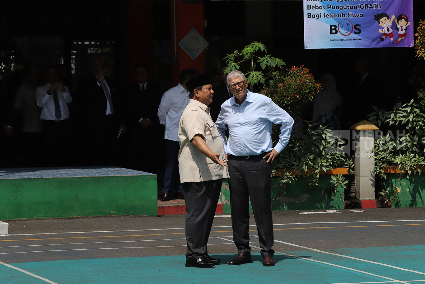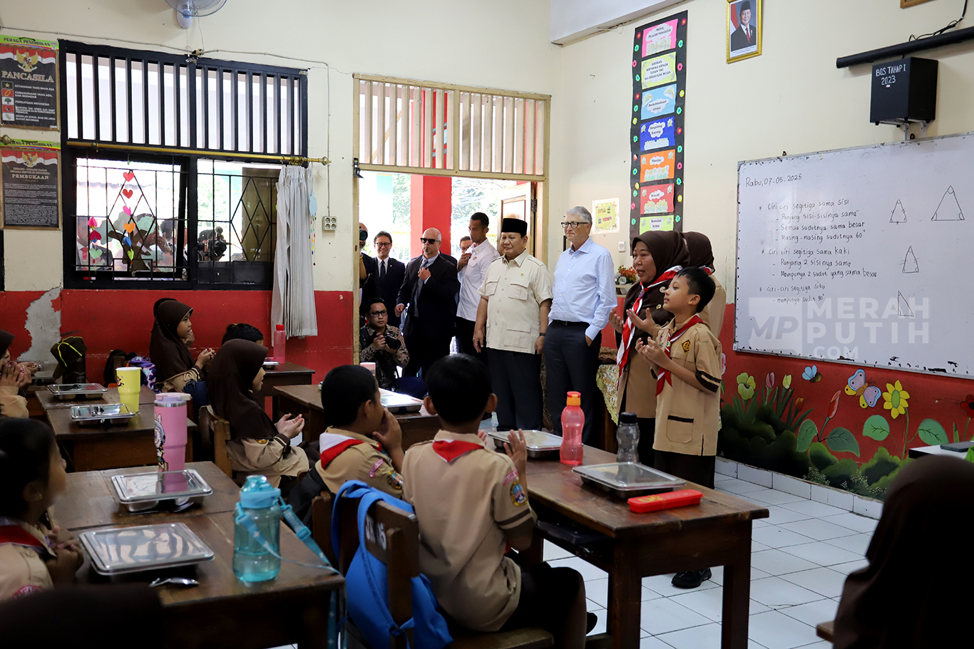 Presiden RI Prabowo Subianto bersama Pendiri Microsoft Group yang juga tokoh filantropi dunia Bill Gates meninjau pelaksanaan program Makan Bergizi Gratis (MBG) di SDN 03 Jati Pulogadung, Jakarta. Selain meninjau pelaksanaan Makan Bergizi Gratis, Presiden Prabowo dan Bill Gates juga melihat ruangan katering pembagian MBG, dan masuk ke dalam kelas menyaksikan langsung siswa menyantap makanan.