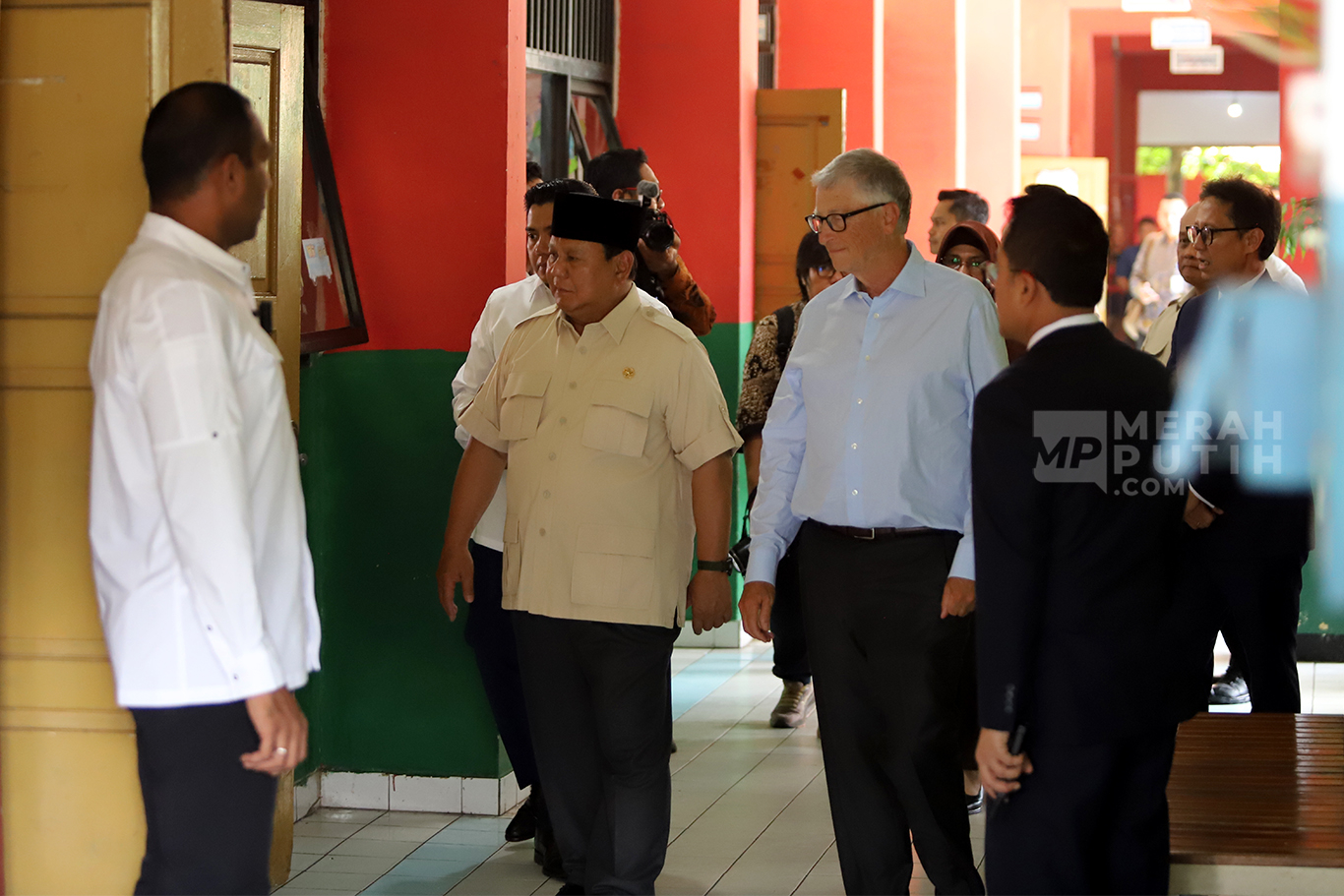 Merahputih.com - Presiden Prabowo Subianto (ketiga kiri) dan Pendiri Microsoft dan tokoh filantropi dunia Bill Gates (tengah) didampingi Seskab Teddy Indra Wijaya (kedua kiri) meninjau pelaksanaan program Makan Bergizi Gratis (MBG) di SDN 03 Jati Pulogadung, Jakarta, Rabu (7/5/2025).
