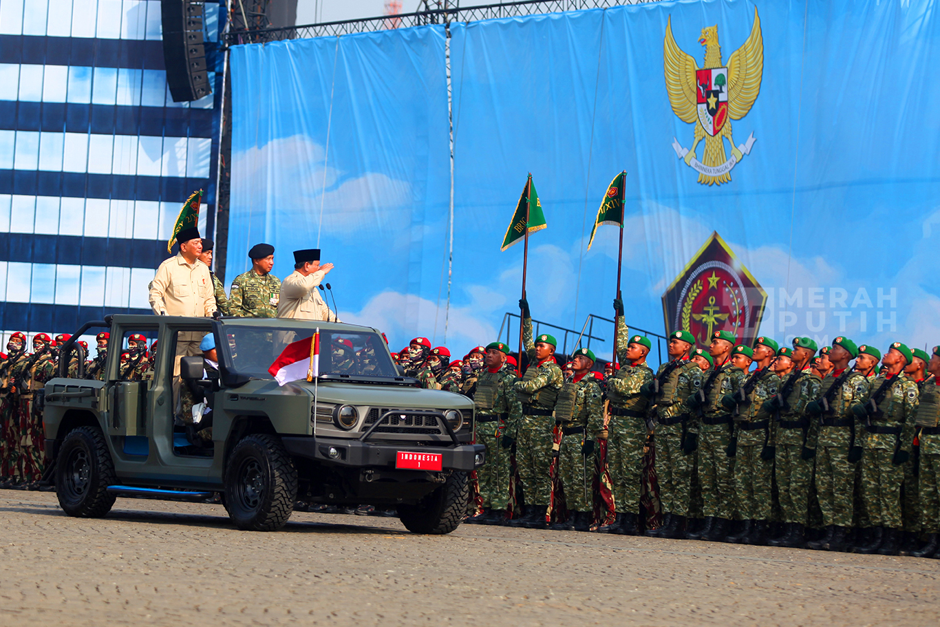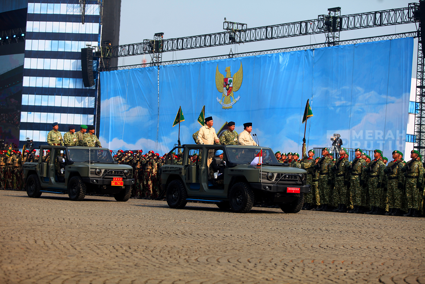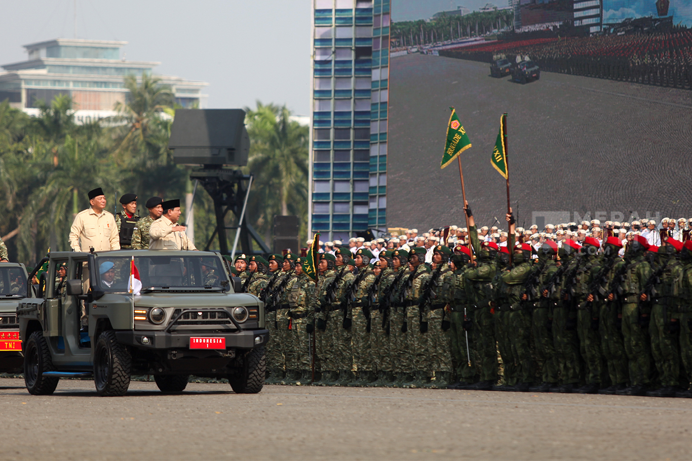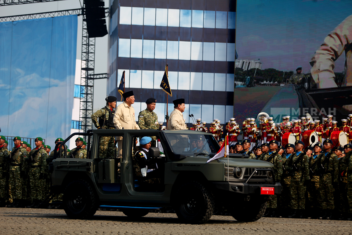 Merahputih.com - Presiden Prabowo Subianto (kanan, atas) didampingi Menteri Pertahanan Sjafrie Sjamsoeddin (ketiga kanan, atas), Panglima TNI Jenderal TNI Agus Subiyanto (kedua kanan, atas) melaksanakan inspeksi pasukan dalam upacara HUT ke-80 TNI di kawasan Silang Monas, Jakarta, Minggu (5/10/2025).