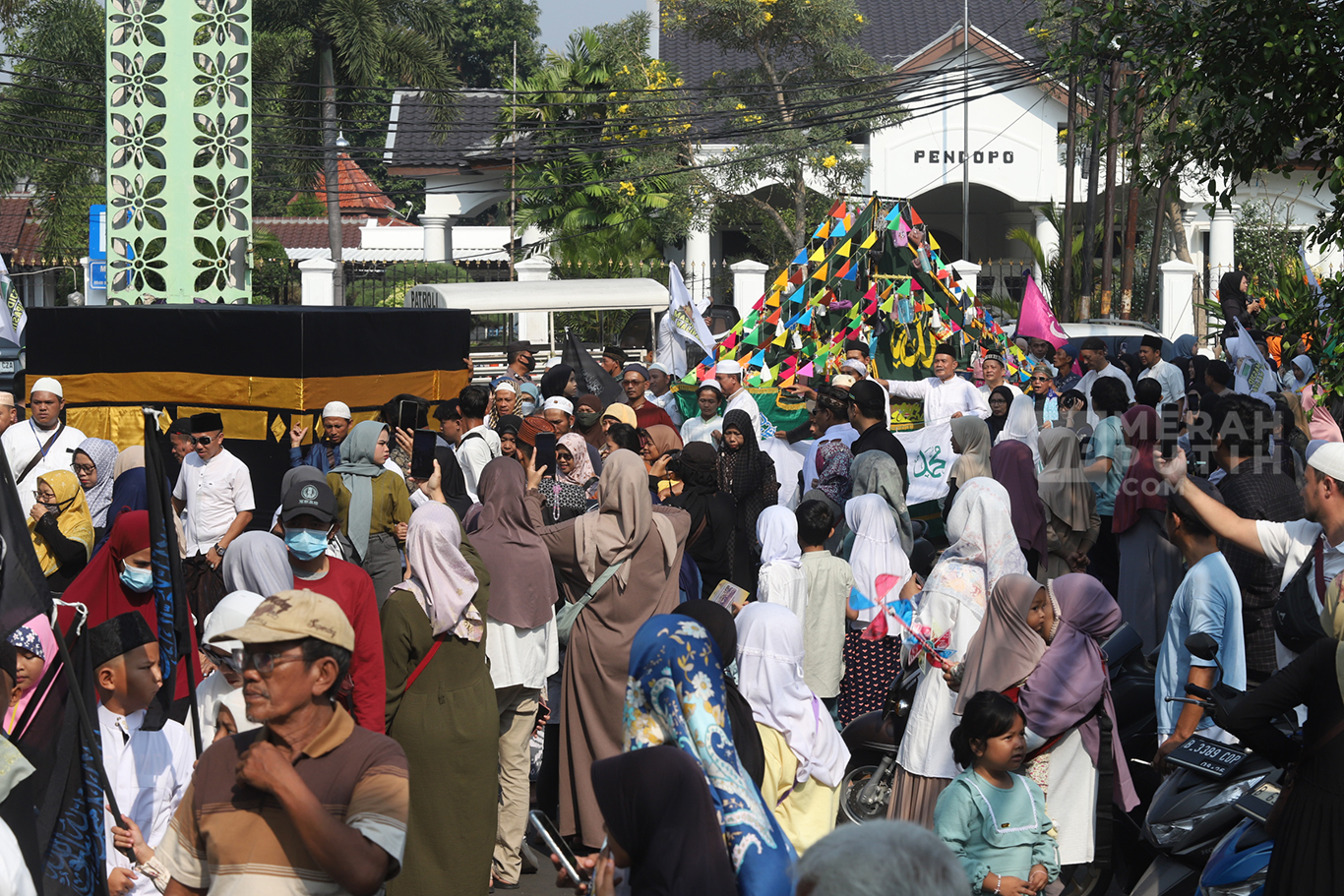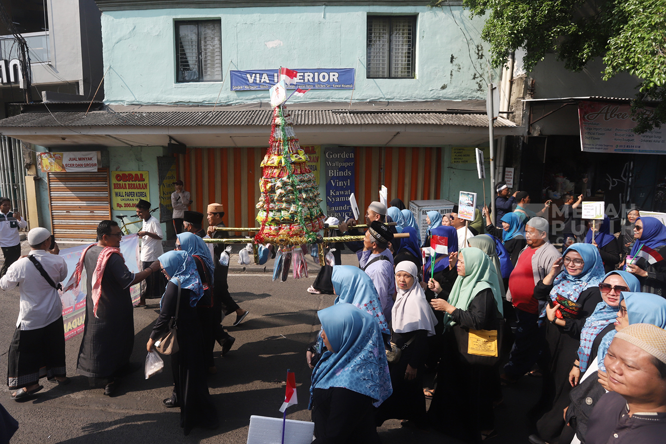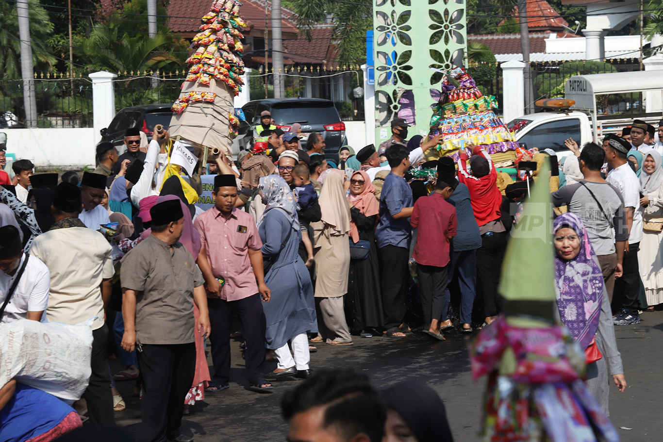 MerahPutih.com - Warga muslim saat mengarak gunungan sebagai tradisi Ngarak Perahu untuk peringati Maulid Nabi Muhammad SAW 1446 Hijriyah di Pasar Lama, Tangerang, Banten, Senin (16/9/2024).