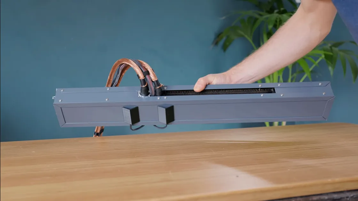 Akhirnya perks mengakalinya dengan membangun sistem water-cooling sendiri dan menempatkan power supply dalam wadah eksternal panjang dan ramping yang dapat ditempatkan di belakang TV.