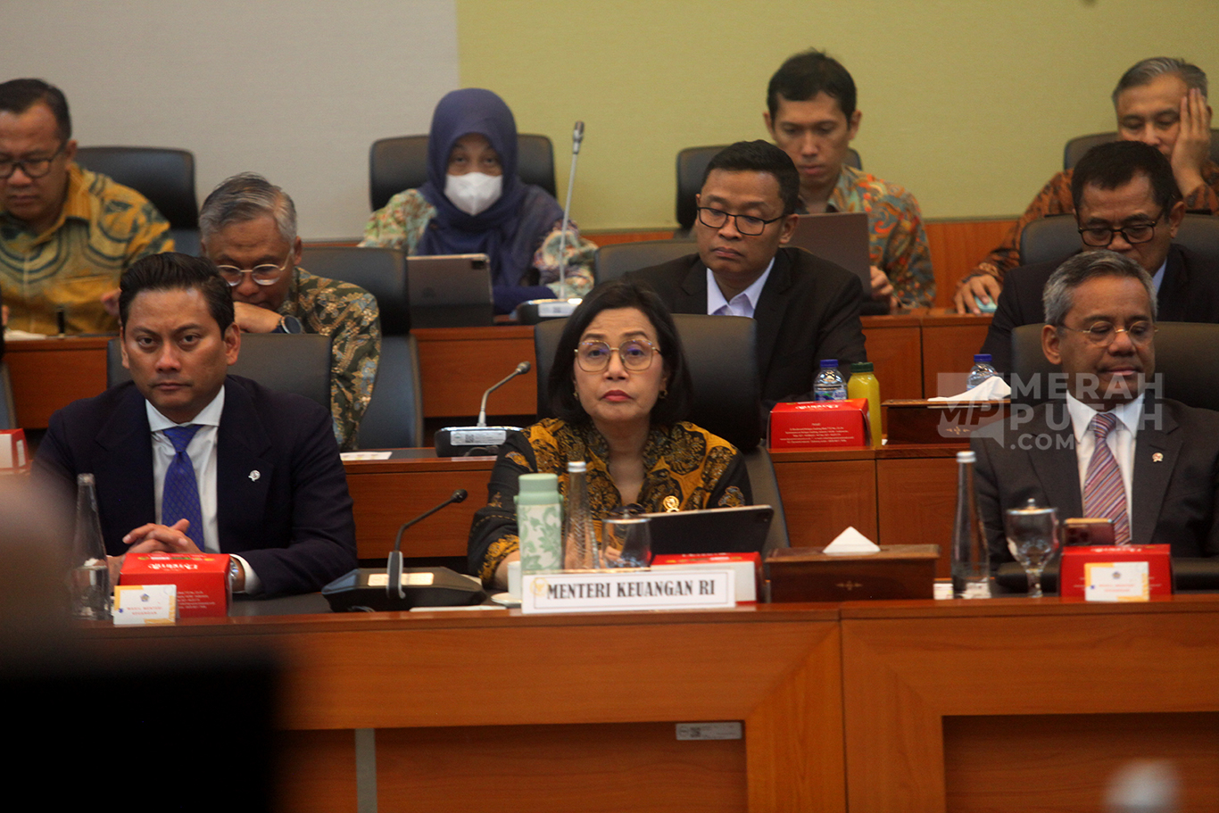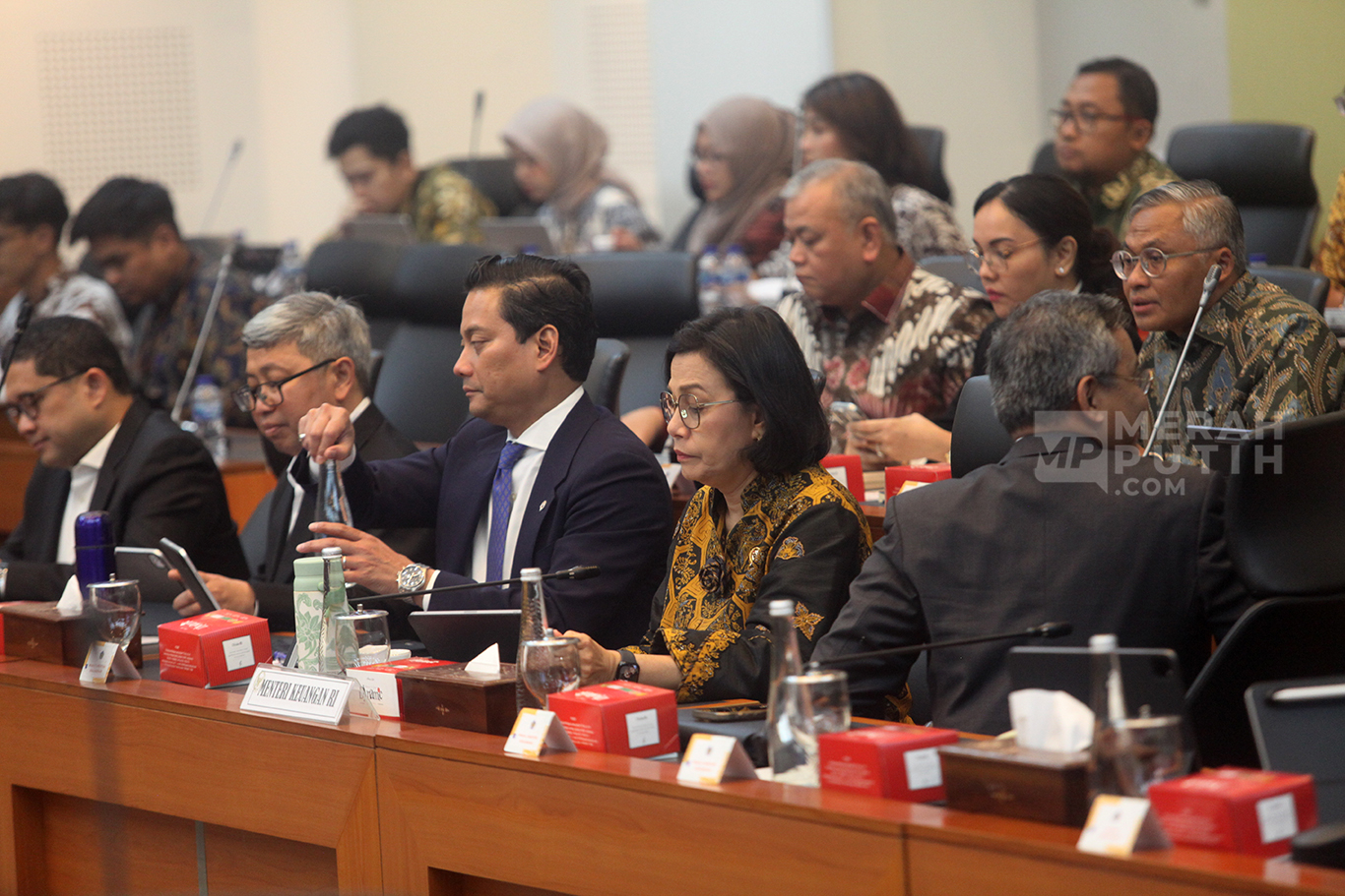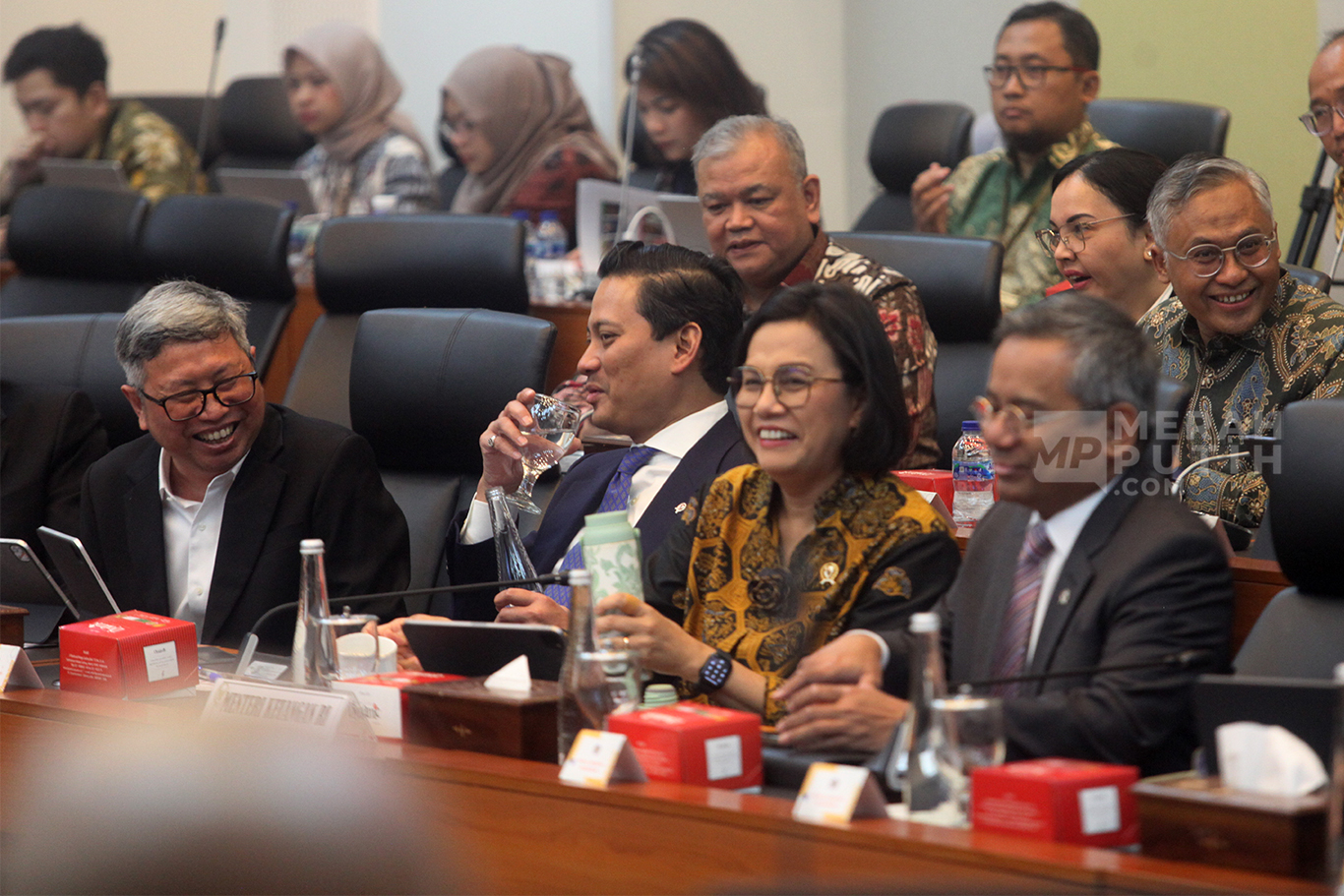 Merahputih.com - Menteri Keuangan Sri Mulyani Indrawati (tengah) didampingi Wakil Menteri Keuangan Suahasil Nazara (kedua kanan), Thomas Djiwandono (kedua kiri), dan Anggito Abimanyu (kanan) mengikuti Rapat Kerja bersama Banggar DPR di Kompleks Parlemen, Senayan, Jakarta, Selasa (19/8/2025).