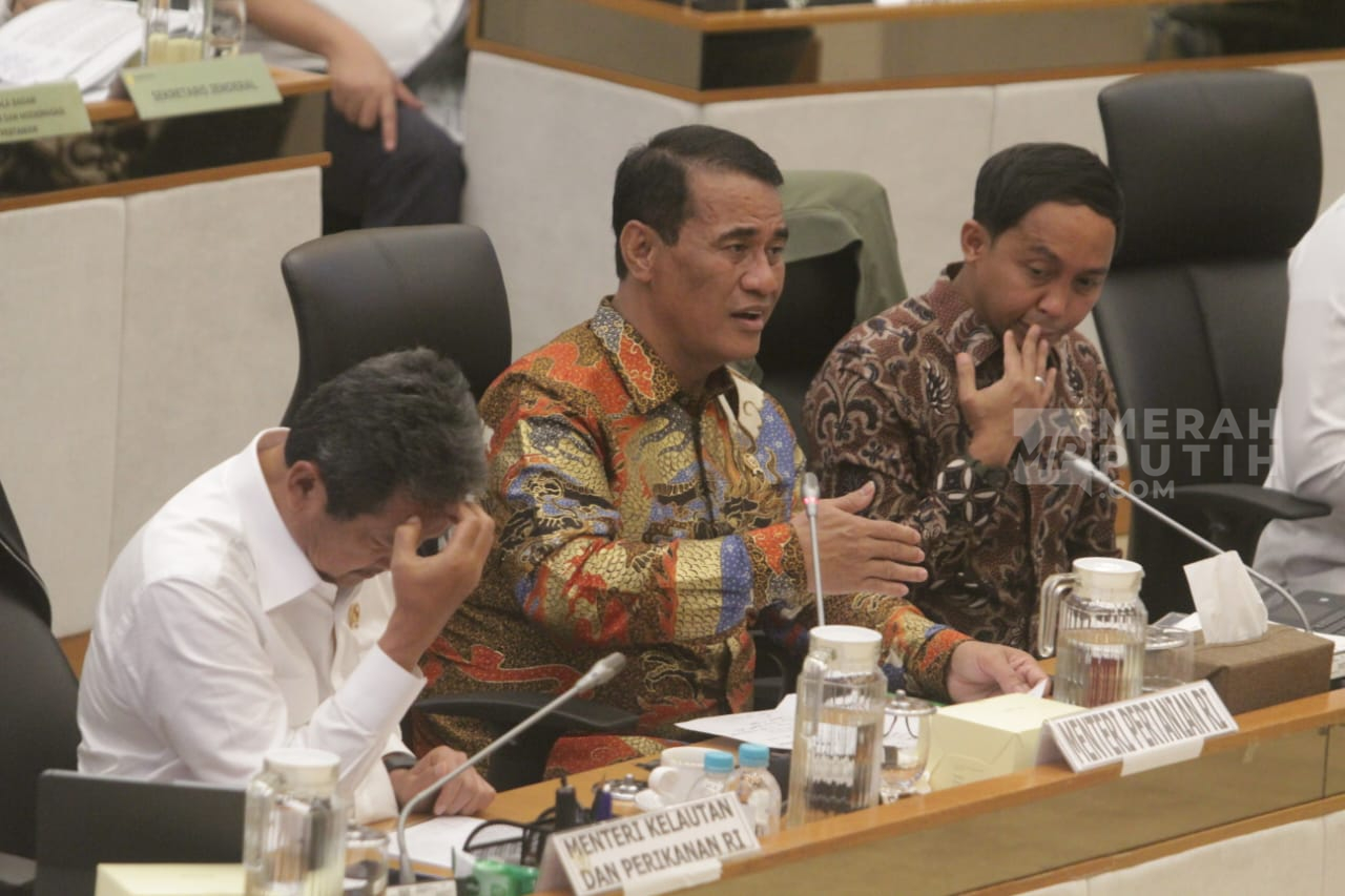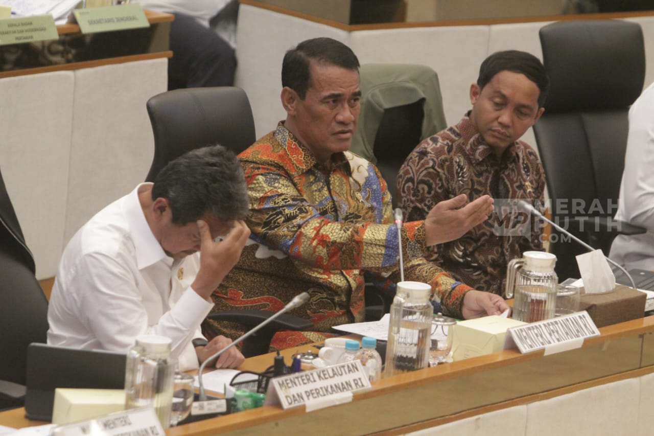 Merahputih.com - Menteri Pertanian Amran Sulaiman (tengah), Menteri Kehutanan Raja Juli Antoni (kanan) dan Menteri Kelautan dan Perikanan (KKP) Wahyu Sakti Trenggono (kiri), mengikuti Rapat Kerja (Raker) dengan Komisi IV DPR, di Gedung Nusantara, Kompleks Parlemen, Senayan, Jakarta, Rabu (14/1/2026).