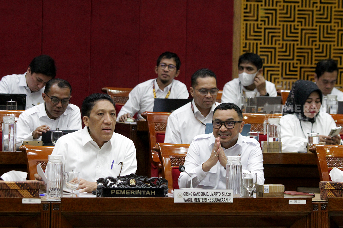 Merahputih.com - Wakil Menteri Kebudayaan Giring Ganesha saat rapat kerja dengan Komisi X DPR di Kompleks Parlemen, Senayan, Jakarta, Rabu (28/8/2025).