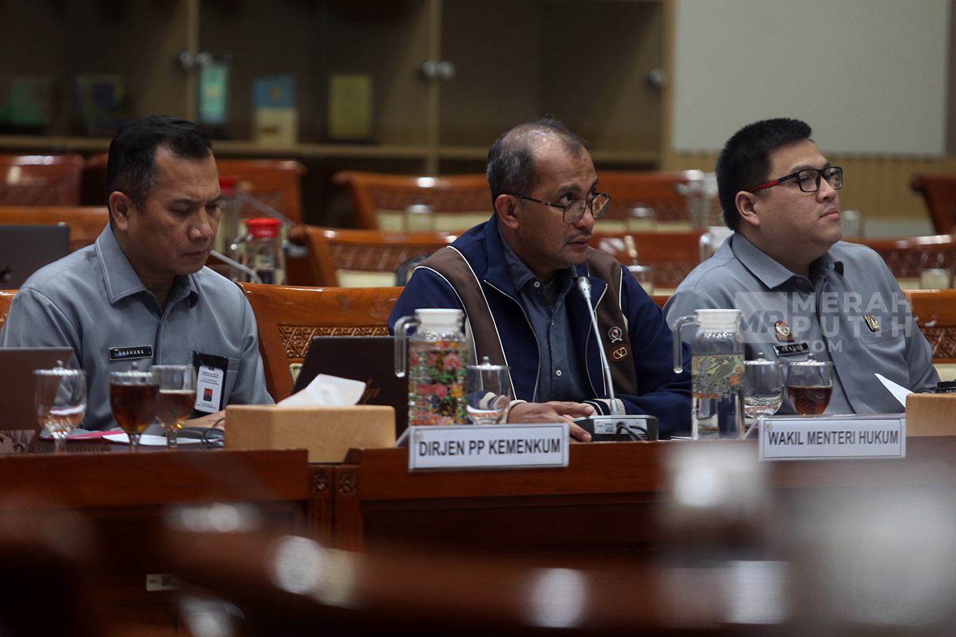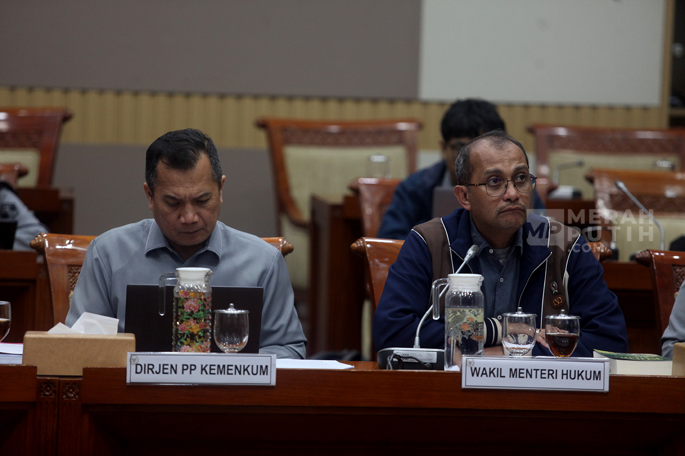 Merahputih.com - Wakil Menteri Hukum Edward Omar Sharif Hiariej menyampaikan paparan pada rapat kerja dengan Komisi III DPR di Kompleks Parlemen, Senayan, Jakarta, Selasa, (2/12/2025).