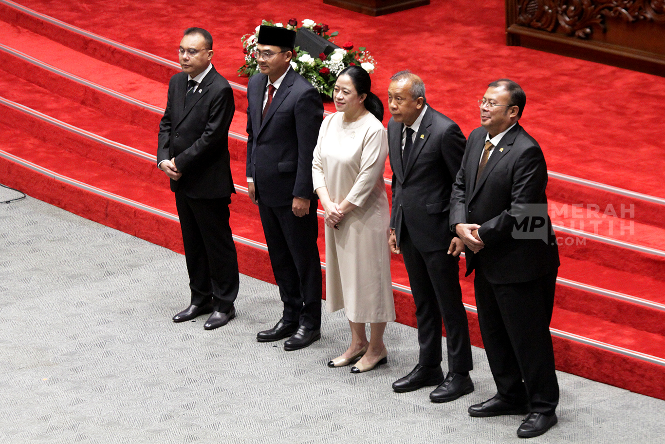 Merahputih.com - Ketua DPR Puan Maharani bersama Wakil Ketua DPR Saan Mustopa, Sufmi Dasco Ahmad dan Cucun Ahmad Syamsurizal berfoto bersama Fauqi Hapidekso usai sumpah jabatan PAW Anggota DPR dalam Rapat Paripurna Ke-7 Masa Persidangan II Tahun Sidang 2025-2026 di Kompleks Parlemen Senayan, Jakarta, Selasa (4/11/2025).