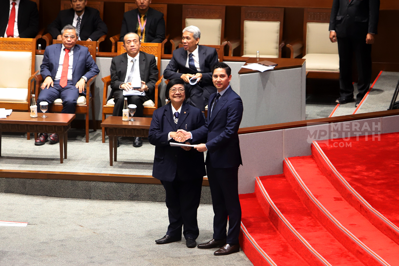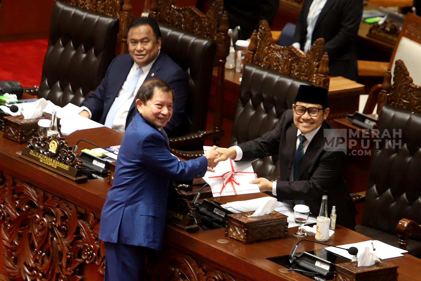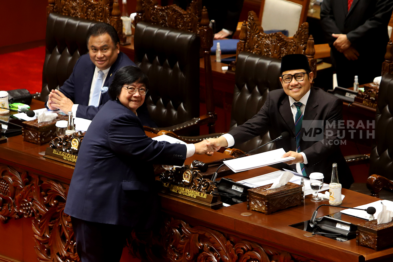 MerahPutih.com- Menteri Lingkungan Hidup dan Kehutanan (LHK) Siti Nurbaya Bakar (kiri) menyerahkan berkas berisi keterangan pemerintah terhadap RUU tentang Perubahan Atas Undang-Undang Nomor 5 Tahun 1990 Tentang Konservasi Sumber Daya Alam Hayati dan Ekosistemnya kepada Wakil Ketua DPR Muhaimin Iskandar (kanan) dalam rapat paripurna DPR di Gedung Nusantara II, Kompleks Parlemen, Senayan, Selasa (9/7/2024).