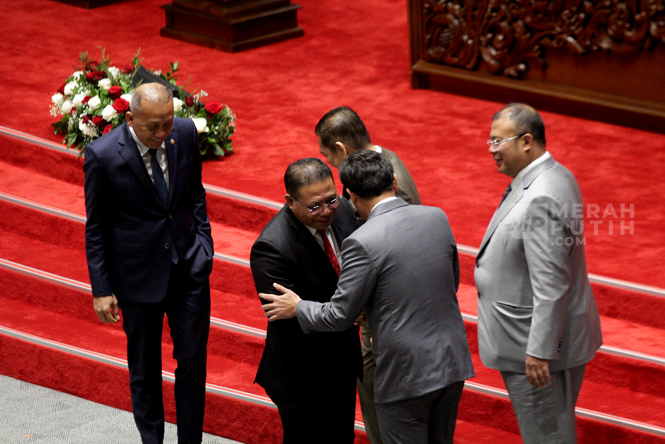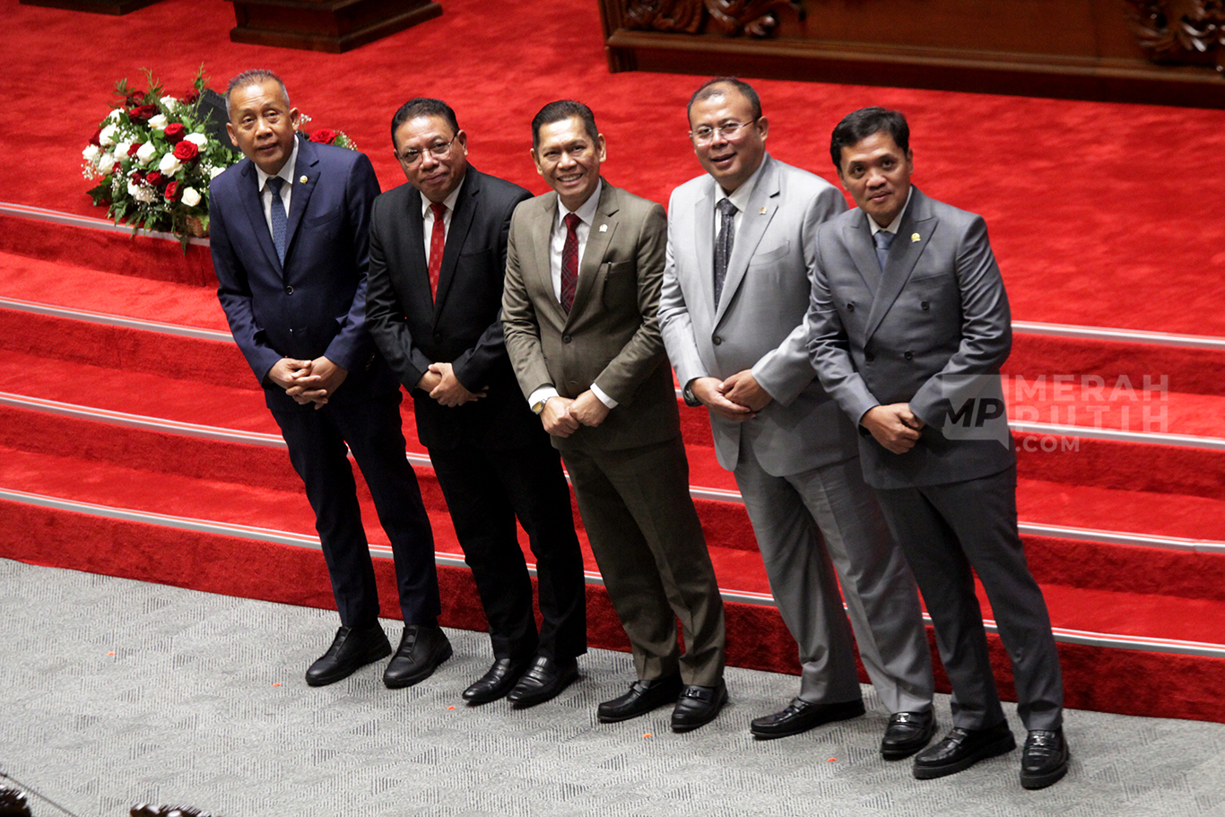 Merahputih.com - Hakim Mahkamah Konstitusi terpilih Inosentius Samsul (kedua kiri) berfoto bersama Wakil Ketua DPR Adies Kadir dan Saan Mustopa dan Ketua Komisi III DPR Habiburokhman dalam Rapat Paripurna DPR ke-3 Masa Persidangan I Tahun Sidang 2025–2026 di Kompleks Parlemen, Senayan, Jakarta, Kamis (21/8/2025).