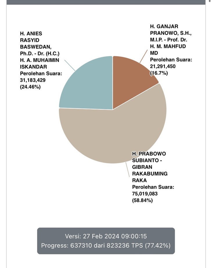 Berdasarkan data di laman pemilu2024.kpu.go.id, Selasa (27/2), pukul 08.30 WIB, KPU menerima suara 637.310 TPS dari total 823.236 TPS. Sehingga, total suara yang masuk dalam penghitungan real count KPU sebesar 77,42 persen.
