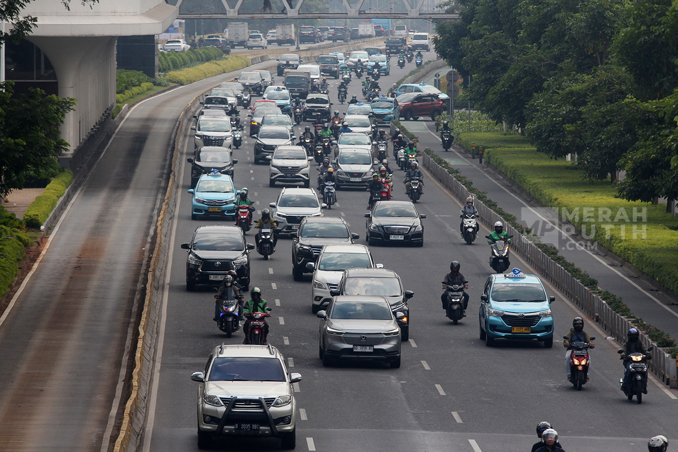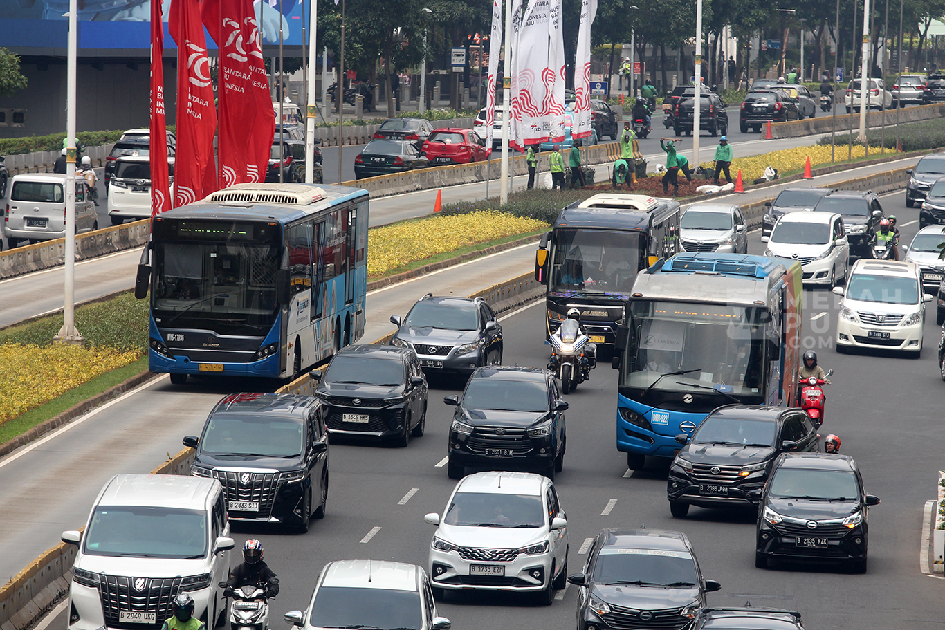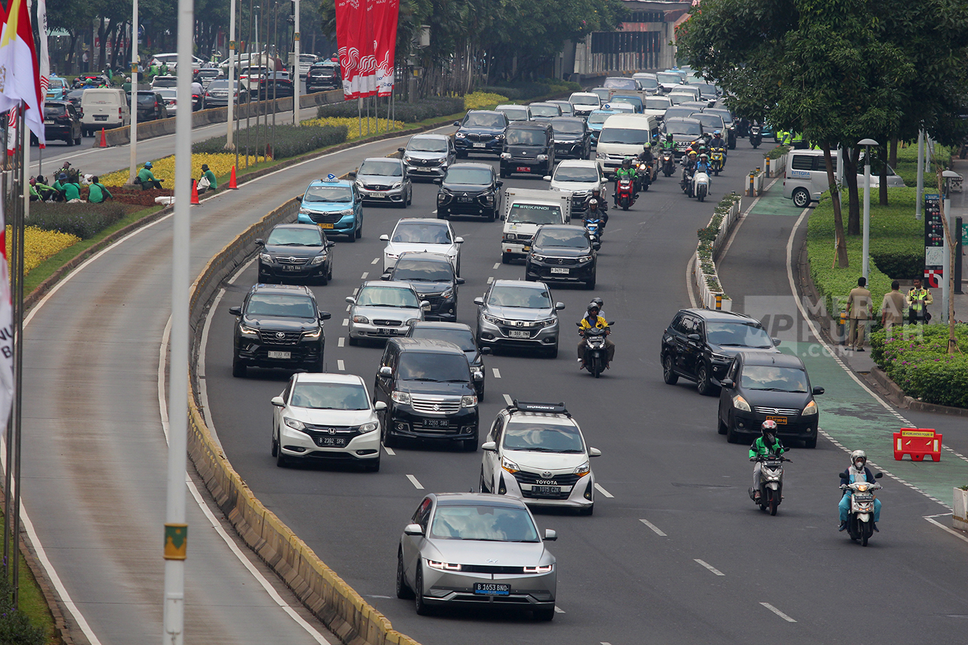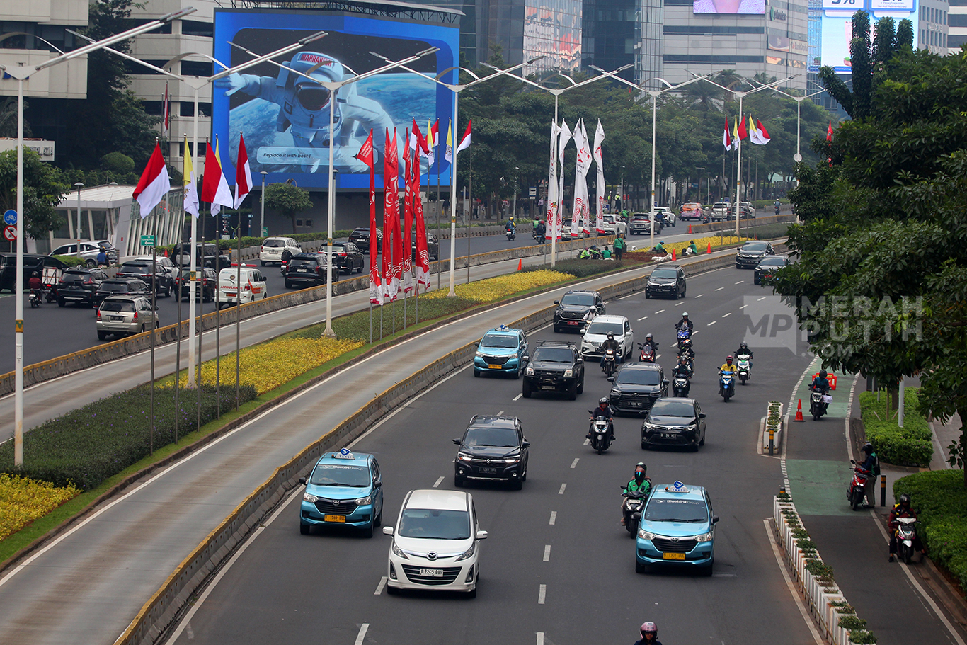 MerahPutih.com - Arus lalu-lintas di Jalan Jenderal Sudirman, Jakarta, Rabu (4/9/2024). Pemimpin Gereja Katolik Dunia Paus Fransiskus akan mengunjungi beberapa lokasi pada hari kedua di Jakarta. Rangkaian kunjungan Paus dilakukan mulai pukul 09.30 WIB ke Istana Merdeka bertemu Presiden RI Joko Widodo (Jokowi).