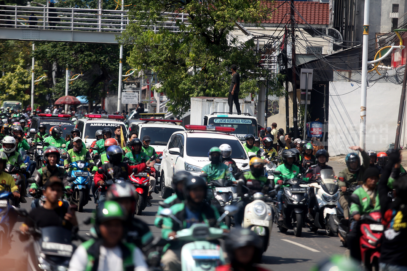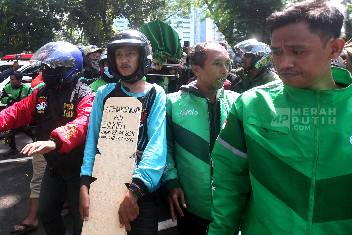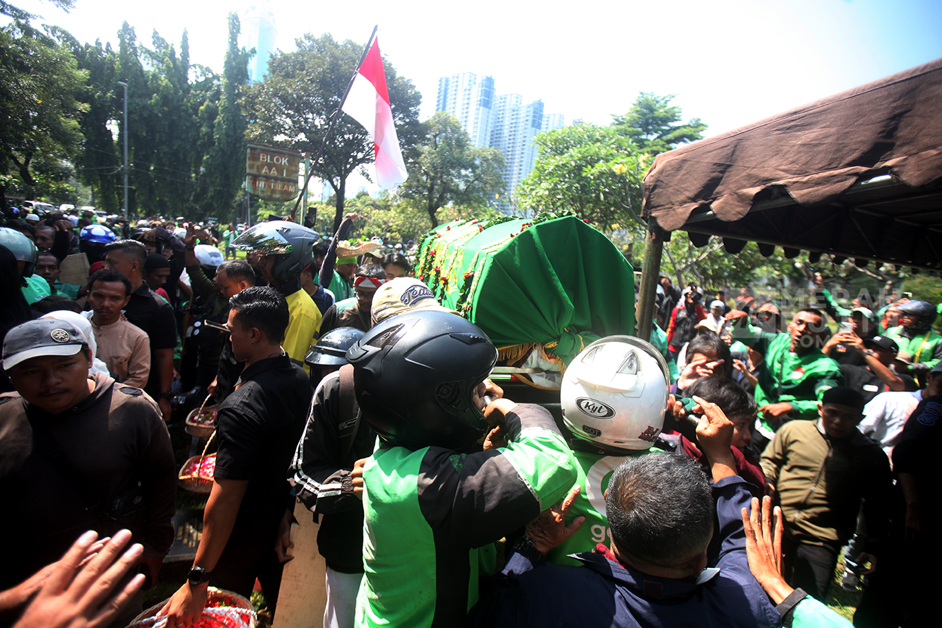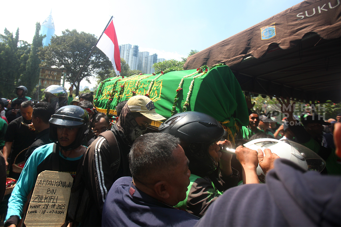 Pemakaman Affan Kurniawan dihadiri ribuan driver ojek online mereka beriiringan dari rumah duka di Jalan Lasem, Menteng, Jakarta Pusat menuju TPU Karet Bivak. Driver ojol Affan Kurniawan (21) tewas dilindas rantis polisi usai demo 28 Agustus yang berujung ricuh di kawasan Pejompongan, Jakarta, pada Kamis (28/8/2025) malam. (MP/Didik Setiawan).