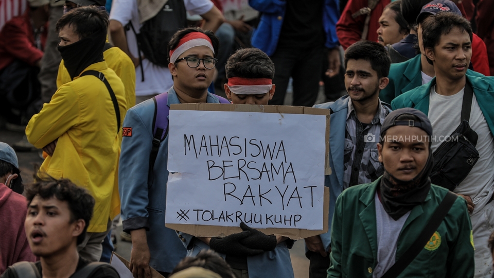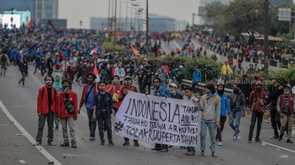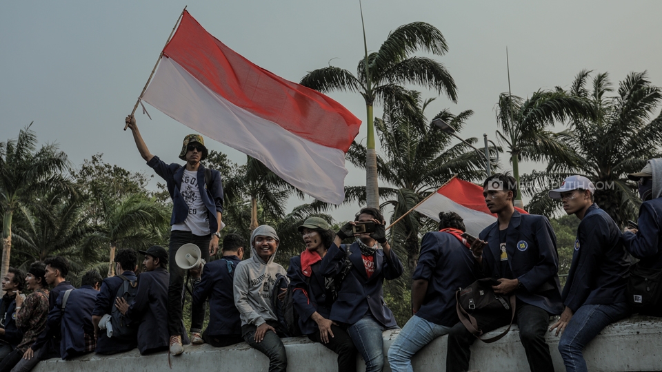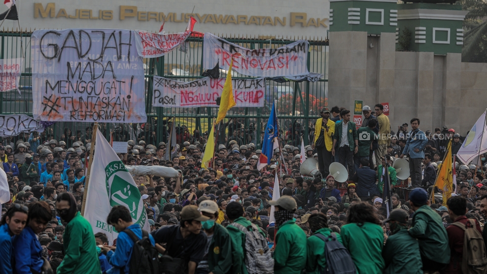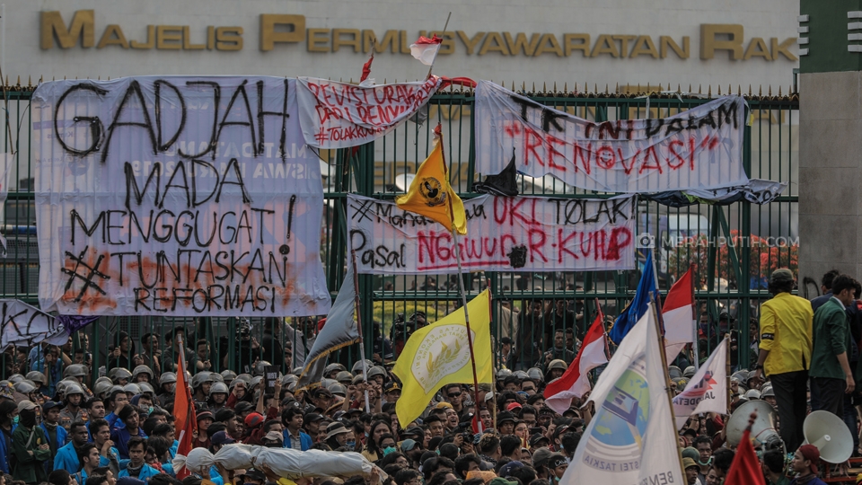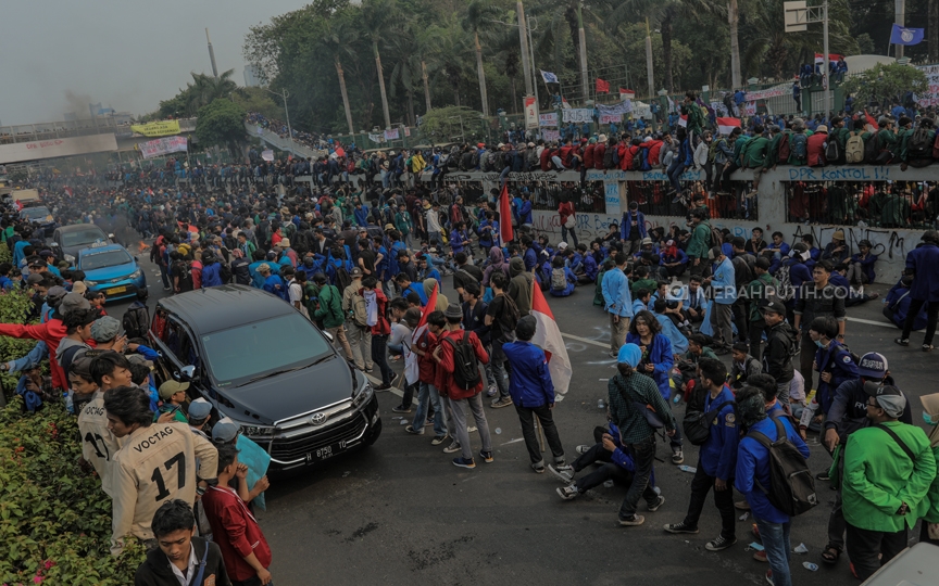 Ribuan mahasiswa melakukan aksi unjuk rasa menolak RUU KPK dan RKUHP di depan Gedung Dewan Perwakilan Rakyat (DPR) Senayan, Jakarta, Selasa, (24/9/2019). Kegiatan unjuk rasa ribuan mahasiswa dari berbagai perguruan tinggi itu menolak RUU KPK dan pengesahan RKUHP yang terjadi di jalan Gatot Subroto di depan Gedung DPR/MPR Republik Indonesia, Jakarta. RKUHP menjadi perbincangan masyarakat karena terdapat sejumlah pasal kontroversial, diantaranya delik penghinaan terhadap presiden/wakil presiden (Pasal 218-220), delik penghinaan terhadap lembaga negara (Pasal 353-354), serta delik penghinaan terhadap pemerintah yang sah (Pasal 240-241). Merahputih.com/Rizki Fitrianto