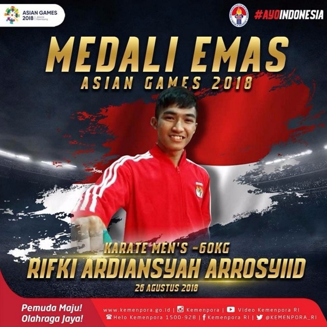 Pada pertandingan yang berlangsung di Plenary Hall Jakarta Convention Center, Minggu (26/8), Rifki sukses mengalahkan karateka Iran, Amir Mahdi Zadeh, dengan skor 9-7 pada laga final.