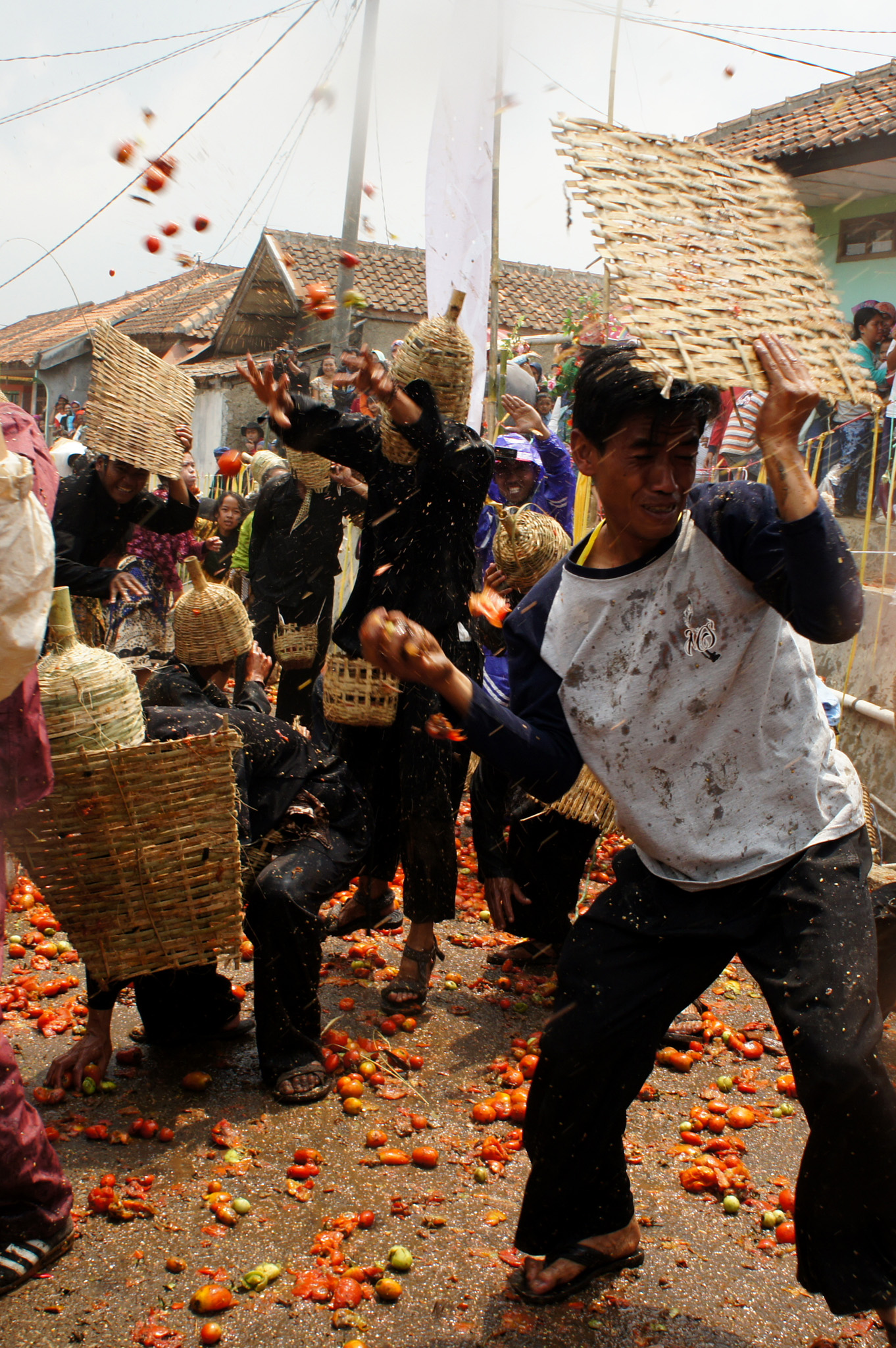 Lalu, mengarak tumpeng dan sayuran di sepanjang jalan Cikareumbi. Barulah, acara puncaknya yakni ritual perang tomat.