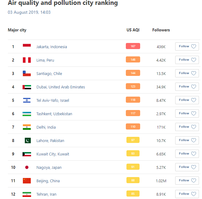 Disusul dengan Kelurahan Mangga Dua Selatan, Jakarta Pusat yang memiliki tingkat indeks kualitas udara di angka 167, setara dengan parameter pm 2.5 dengan konsentrasi 88,4 µg/m³.