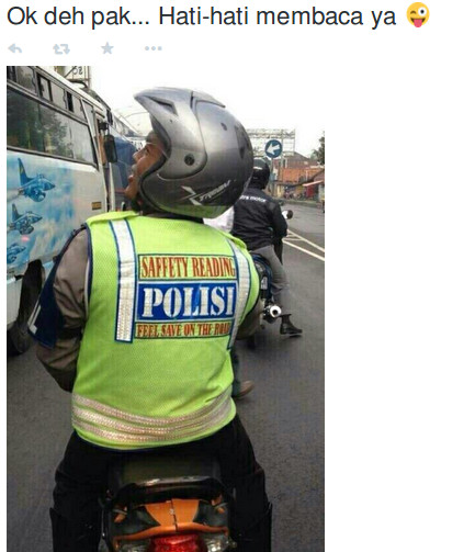 Salah satu cara para pengatur lalu lintas itu adalah mengenakan rompi dan helm saat berkendara, khususnya ketika mengendarai sepeda motor. Tapi, para polantas ini sepertinya gagal fokus, niat hati ingin menyuarakan Safety riding dengan tulisan berbahasa Inggris di rompi mereka, para masyarakat justru malah kebingungan. (Baca: Usai 'Polisi Ngamuk' Kini Timbul 'Polisi Rasis')