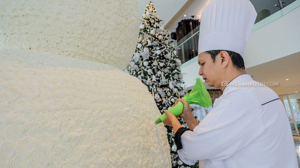 Pekerja tengah membuat boneka salju raksasa yang terbuat dari "Icing Sugar" yang menghiasi lobby gedung Hotel JHL Solitaire, Gading Serpong, Tangerang, Banten, Selasa, (3/12/2019). Menyambut hari raya Natal, Hotel JHL Solitaire membuat boneka salju raksasa berukuran tinggi 4,5 meter dengan diameter 1,8 meter yang terbuat dari "Icing Sugar". Pembuatan boneka salju tersebut menghabiskan 195 Kg gula, putih telur dan cuka dengan empat hari lama pengerjaan. Merahputih.com / Rizki Fitrianto