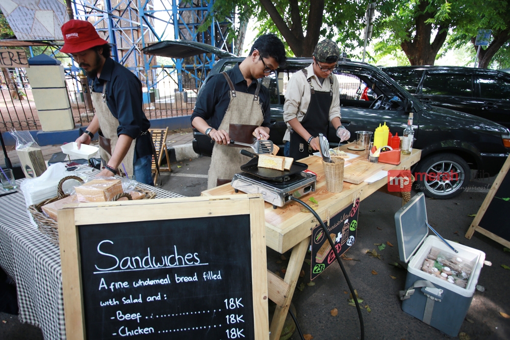 Suasana kuliner Sandwich Attack yang berlokasi di kawasan Alun-alun Kota Tangerang (lapangan A. Yani), dengan perlengkapan sederhana mereka (Yosho, Isank, dan Agam) menjual Sandwich lezat yang sangat hits di Kota Tangerang. Rabu, (6/1) Merahputih.com / Rizki Fitrianto.