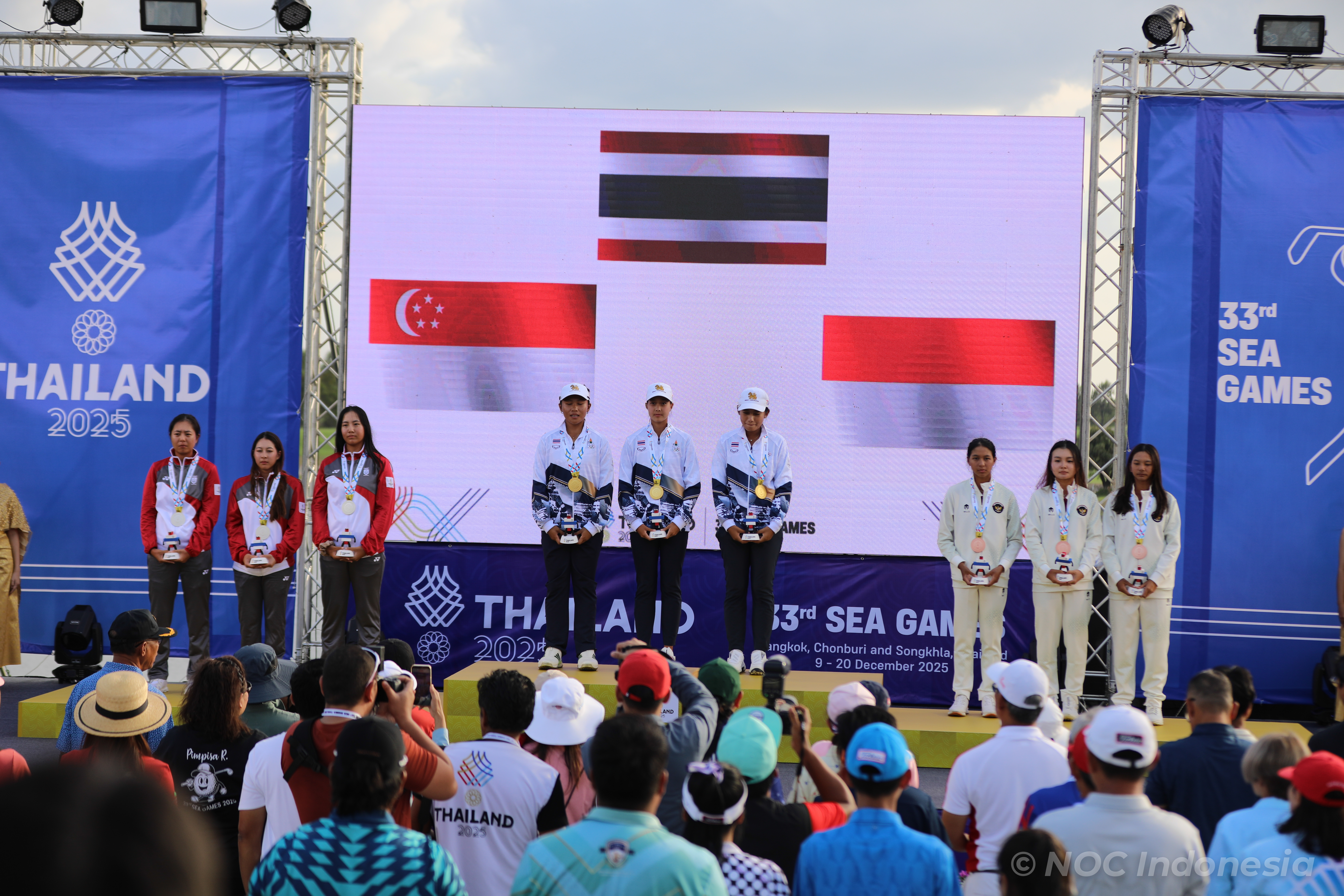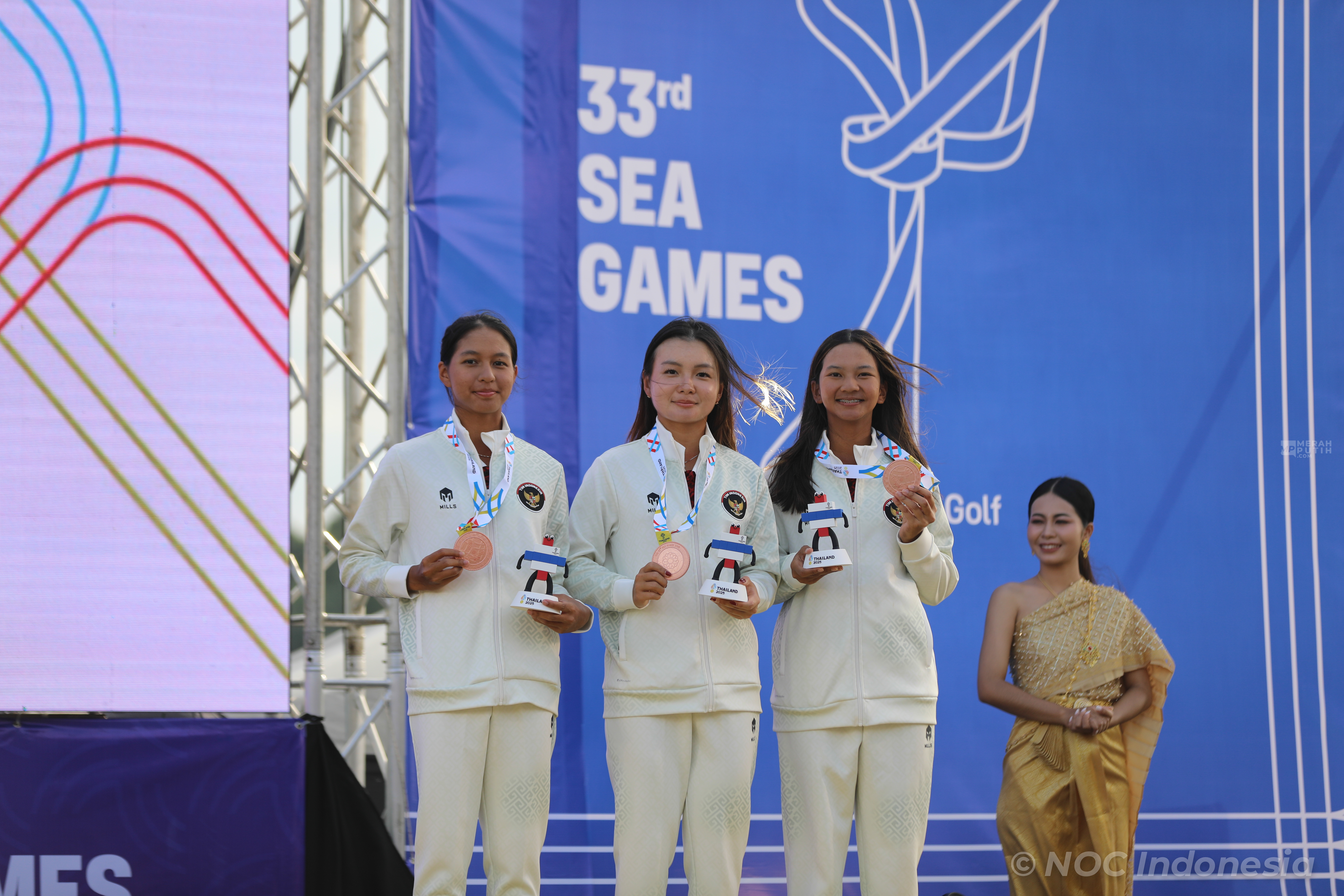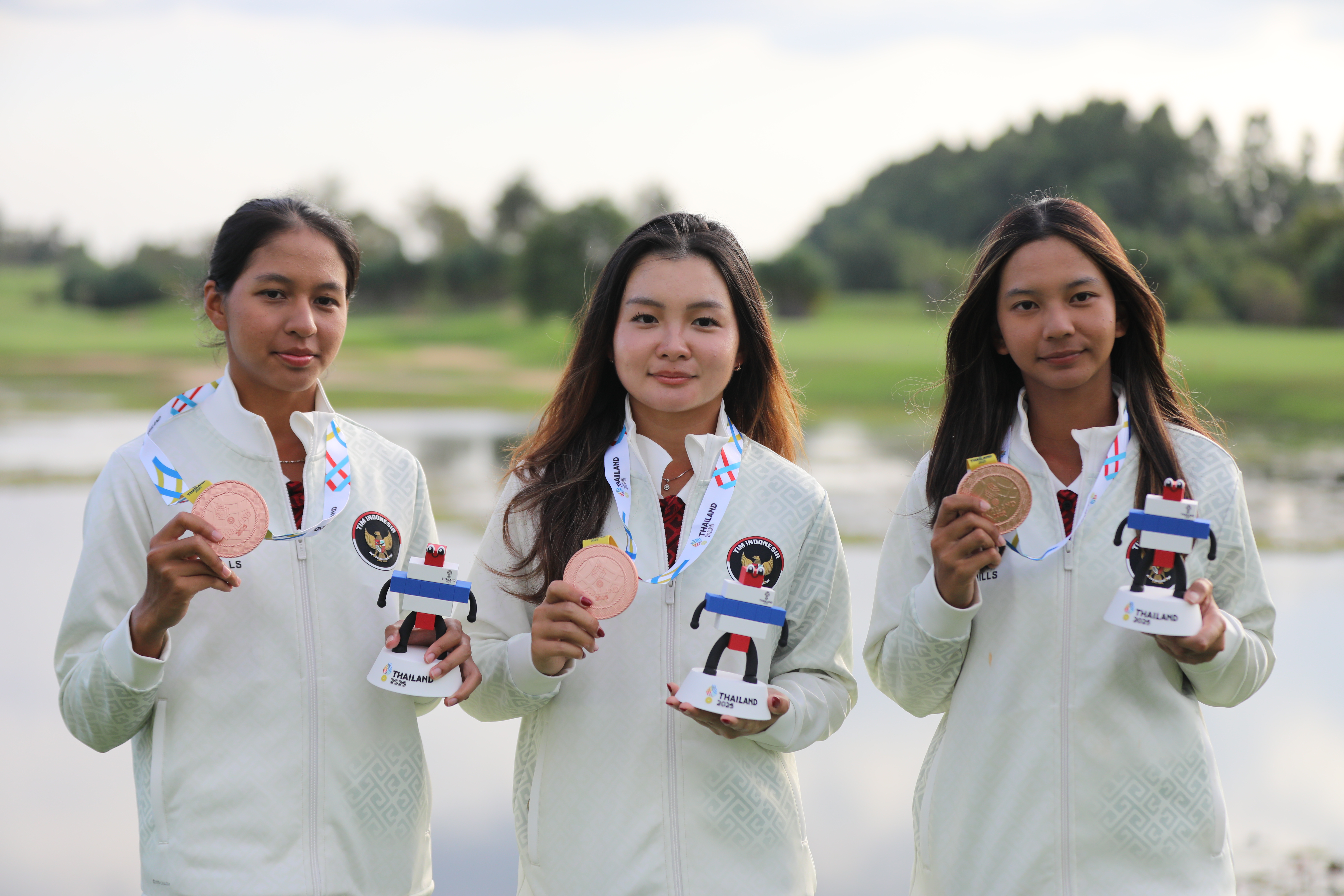 Tim golf putri Indonesia berhasil mempersembahkan medali perunggu pada nomor Tim Putri Golf SEA Games 2025 Thailand setelah bersaing ketat dengan sejumlah negara kuat Asia Tenggara. Penampilan konsisten Bianca Naomi Amina, Elaine Widjaja, dan Sania Talita Wahyudi sepanjang rangkaian pertandingan menjadi kunci keberhasilan kontingen Merah Putih naik podium. Medali emas diraih oleh tim tuan rumah Thailand sedangkan medali Perak di raih oleh tim golf putri Singapura. (Foto: NOC Indonesia/MP/Didik Setiawan).
