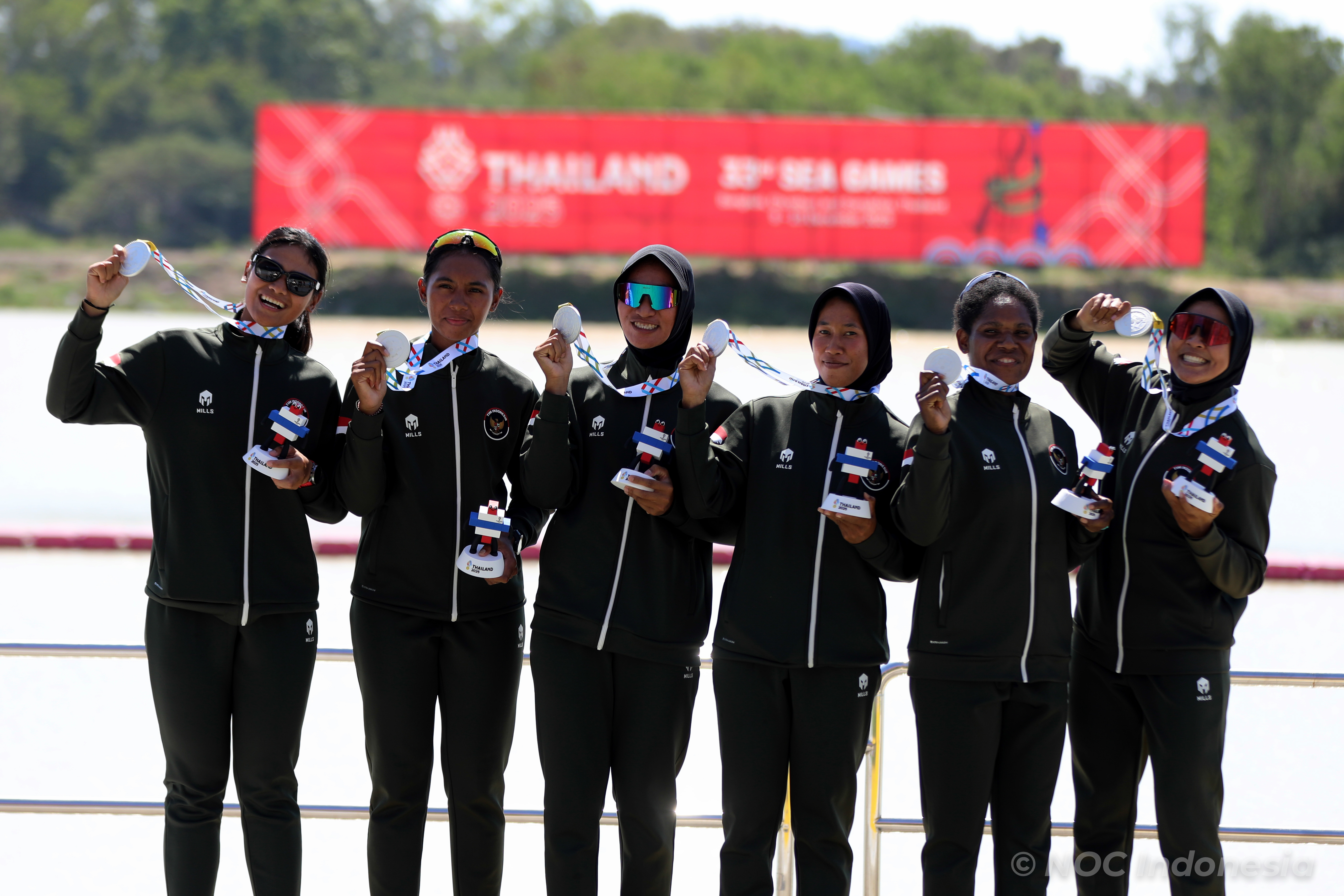 Tim dayung putri Indonesia berhasil meraih medali perak dengan catatan waktu 7 menit 43,294 detik sedangkan medali emas diraih Vietnam dengan waktu 7 menit 31,847 detik dan medali perunggu diraih tuan rumah Thailand dengan catatan waktu 7 menit 47,647 detik. (Foto: NOC Indonesia/MP/Didik Setiawan).