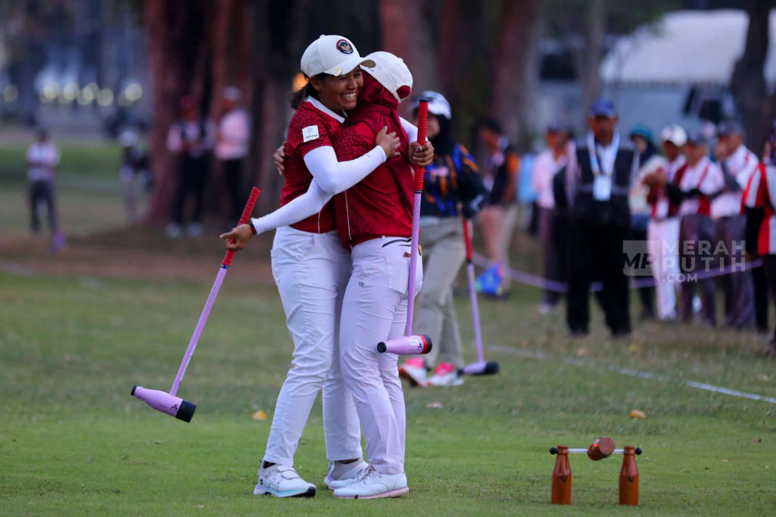 Merahputih.com - Atlet Woodball Putri Indonesia Ni Luh Manik Purwati (kiri) dan Nur Hafifa Syarah (kanan) saling berpelukan usai berhasil memasukkan bola ke dalam gate pada laga final melawan Malaysia di nomor Grup Putri Fairway SEA Games 2025. Pertandingan berlangsung di Royal Fleet Golf Course, Sattahip District, Chon Buri, Thailand, Jumat (12/12/2025).